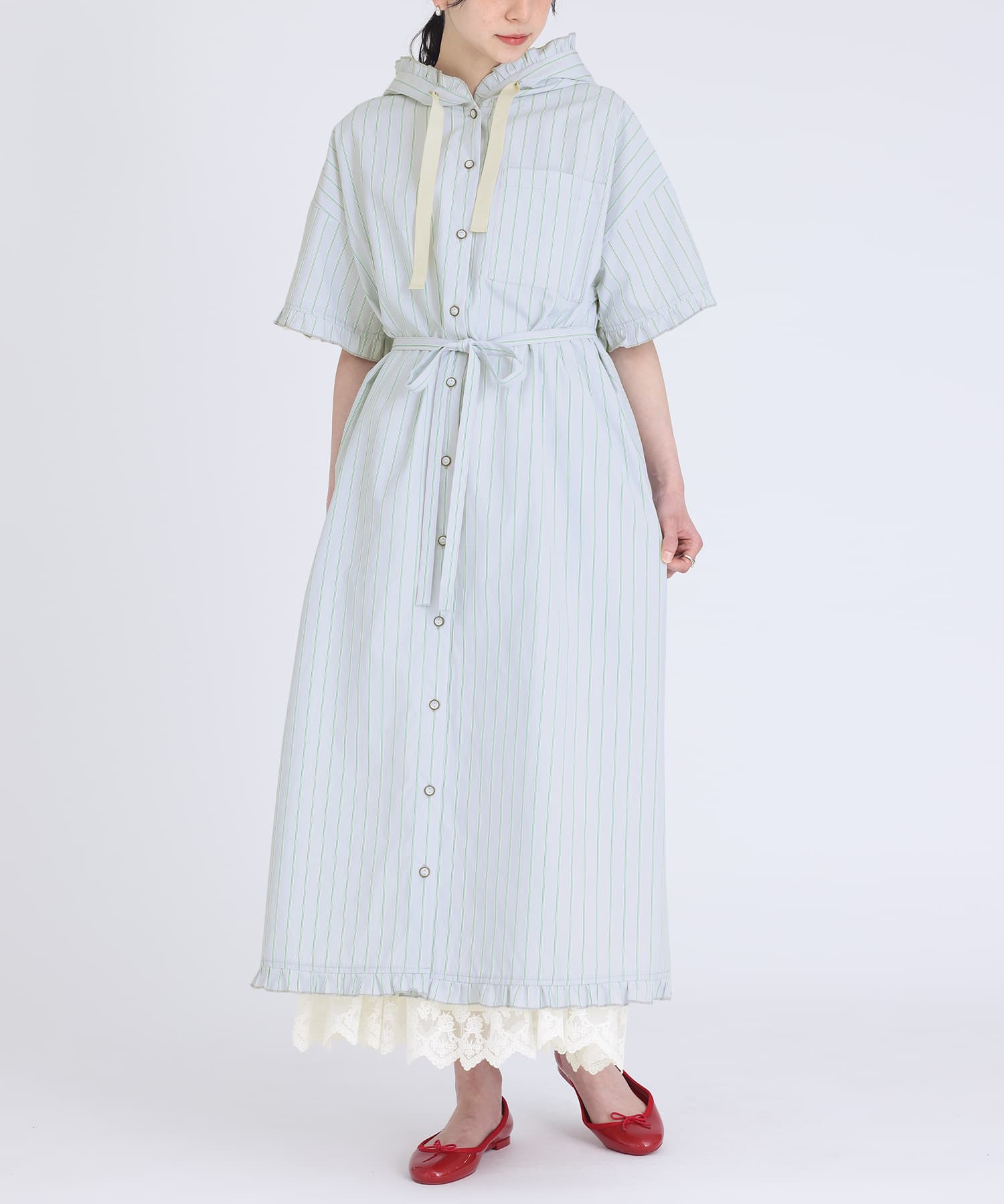 デザイン爽やかな配色のストライプ柄シャツワンピース。袖口・裾・フード周りのフリルがポイントになったデザイン。すとんとしたすっきり見えするシルエットです。ウエストリボン付きで、気分に合わせてシルエットに変化をつけられる一枚。 素材さっぱりとした肌触りのシャツ生地。密度のある生地のため、透けずに一枚でもご着用いただけます。 ディテール・両脇シームポケット・胸ポケット・グログランテープのフード紐 コーディネート甘くなり過ぎず程良くカジュアル感もあるアイテムのため、デニムと合わせてもお洒落にきまります。レースのパンツを裾から覗かせても 羽織りとしてもご着用いただけます。 スタッフ試着データ【1(M~L)】袖丈:ちょうどひじ位着丈:くるぶし上7cm位腕周り:ややゆったりバスト:ややゆったりウエスト:ゆったりヒップ:ゆったり全体:ややゆったり程よい