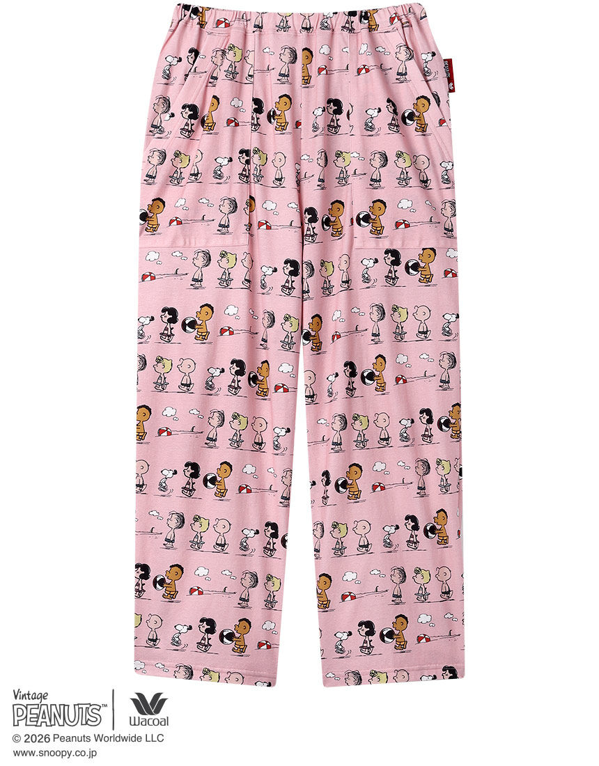 1950年に新聞コミックとしてスタートした「PEANUTS」とワコールがコラボレーション。世界中で愛されるスヌーピーや個性豊かな仲間たちのデザインでおうち時間を楽しんで。・本体に、暑い季節にここちよいシャリ感のある強撚糸を用いた綿100%の天竺素材を使用・スヌーピーと仲間たちが海で夏を楽しむ様子をプリント・ワイドなシルエットで、暑い季節におすすめ【サイズ詳細】8分丈M:ボトム脇丈83.0cm 裾まわり54.0cm ウエスト58.0cm 股下(レングス)53.0cm ヒップ107.5cm L:ボトム脇丈83.5cm 裾まわり56.0cm ウエスト63.0cm 股下(レングス)52.5cm ヒップ111.5cm LL:ボトム脇丈84.0cm 裾まわり59.0cm ウエスト68.0cm 股下(レングス)52.5cm ヒップ116.5cm※出来上がり寸法を表示しております※サイズ詳細の寸法には多少の差異がございます 出来上がり寸法の測り方についてはこちら※アイテムによって柄の出方が異なりますのでご了承ください。