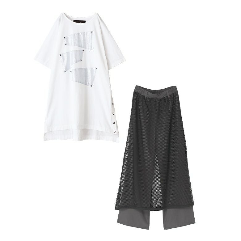 ■異素材アシメデザインチュニックTシャツ×メッシュレイヤードパンツコーデ2点SET パンツ1(M~L) トップス(Fサイズ)