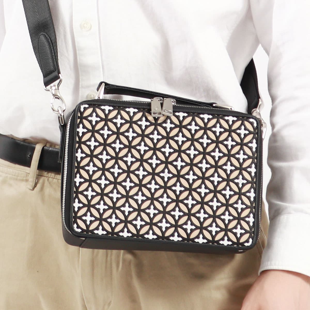 アシンメトリーなフォルムが視線を奪う、大人の手元に相応しいバッグ。ニュアンス感のある洗練シルエットにストラップに配したメタリックアクセントが映える、存在感溢れる一品です。マチが薄めのスマートなシルエットながらも、貴重品が無理なく入るデイリー使いにぴったりなサイズ感。ソリッドな質感と落ち着きのあるカラーが日常のスタイルをアップデートしてくれます。デイリーカジュアルにもセミフォーマルにも、どんな時もつい合わせたくなる一品です。※内ポケット