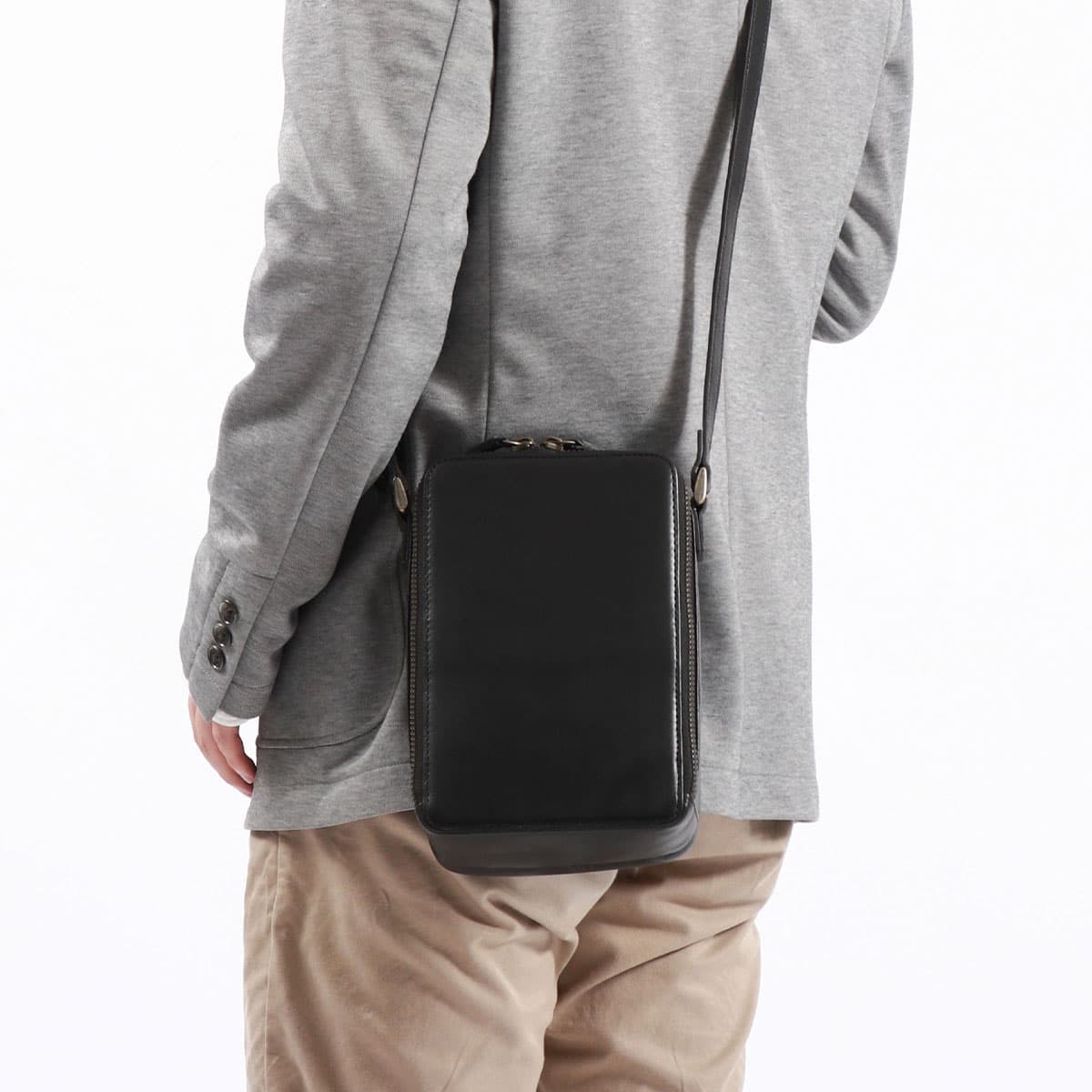 縦型のスクエアフォルムがスタイリッシュなショルダーバッグ。素材に革の風合いを感じるヌメ調の牛革を用いて、フォーマルになりすぎない大人カジュアルな雰囲気に仕上げています。