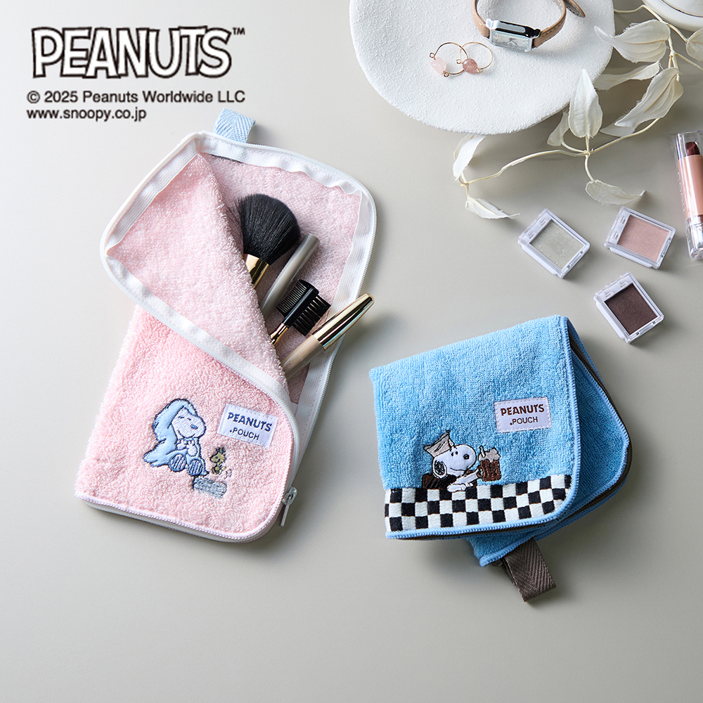 タオルハンカチにファスナーが付いたような見た目がユニークお出かけの際に必要な小物を、気軽に収納してバッグにインメイク用品やアクセサリー、サニタリー用品などを持ち歩く際に便利ペットボトルや折りたたみ傘の収納にもおすすめ保冷剤を入れるとひんやりと気持ちよく、アイピローとして使うなどリラックスしたいときにも◎かわいいスヌーピーをデザインした2柄から