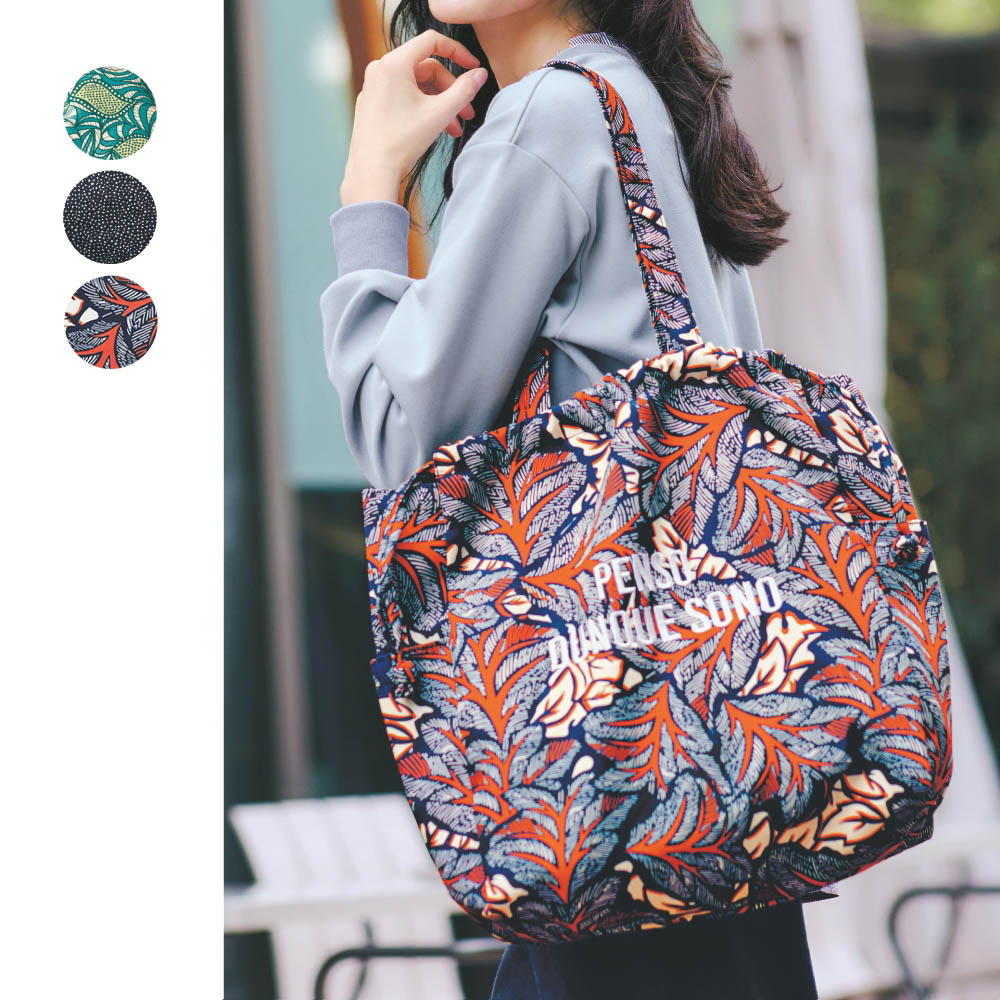 ―デザイン・スタイリング―・お稽古バッグにピッタリな大容量のビッグトート・リゾート感のあるモチーフプリントがおしゃれ・サイドと中には大きめのポケット付き・開閉口は巾着のように絞ることも可能・持ち手は肩にかけられる長さ