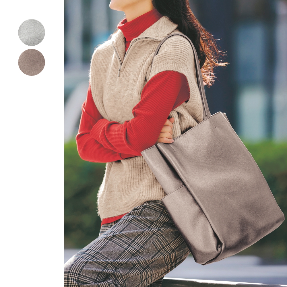 ーデザイン・スタイリングー・A4サイズの書類がすっぽり入るサイズ感・デイリーからビジネスシーンまで幅広く対応・1枚合皮で仕立てたトートバッグ・多彩なポケット付きで使い勝手抜群・底面が汚れにくく、直立しやすい底鋲付きー素材ー・シボ感のある落ち着いた風合いの合成皮革―メーカー品番―8145プラグマ/PRAGMA「大人のエレガンス」をテーマに、デザイン性と実用性を備えた「考えるファッション」を提案します。ブランド名は、哲学用語のpragmatism(実用主義・道具主義)に由来しています。