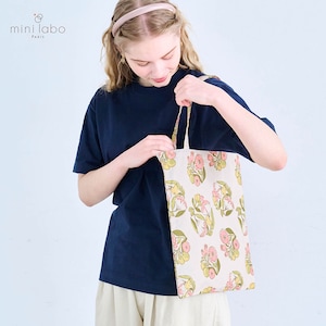 ―デザイン・スタイリング―・ミニラボの繊細なアートが全面にプリントされた華やかなデザイン・日常使いにちょうどいい、A4サイズも収まるサイズ感・肩掛けしやすい長めの持ち手で、荷物が多い日も安心・内生地配色がさりげなく可愛い―素材―・身生地はナチュラルな風合いの綿100%素材・裏地付きでしっかりとした仕上がり