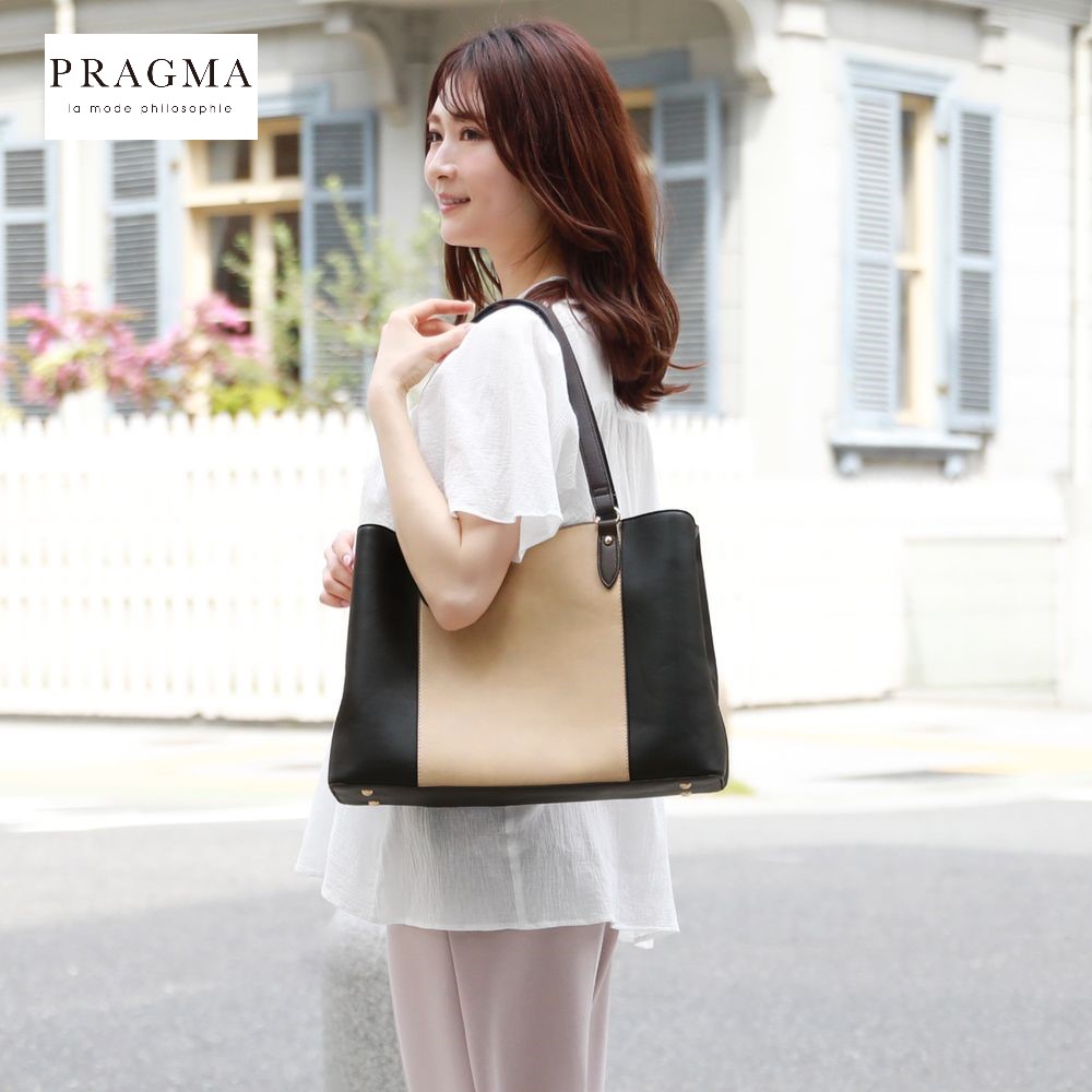 ―デザイン・スタイリング―・おしゃれな裏地のストライプ柄・普段使いはもちろん、通勤にもぴったりなトートバッグ・収納が分かれているので荷物をすっきり整理可能―素材―・上質感のある合成皮革―機能―・荷物を整理整頓しやすい3室構造・大きく開いて中身が出し入れしやすいメイン室・A4ファイルに対応した便利なサイズ感・肩掛けもできる長めのハンドルプラグマ/PRAGMA 「大人のエレガンス」をテーマに、デザイン性と実用性を備えた「考えるファッション」を提案します。 ブランド名は、哲学用語のpragmatism(実用主義・道具主義)に由来しています。