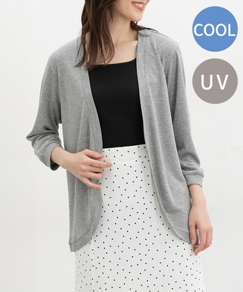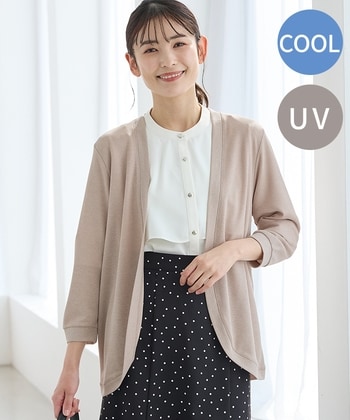 ひんやり快適『ハニさら』カーデ【デザイン】さっと羽織れるボタンレスのシンプルデザイン。ゆったりめの幅とヒップまで隠れる丈感で体型もカバー。【素材・機能】環境に優しい再生ポリエステルを使用した、さらっとした肌触りのレーヨン混素材。ひんやり快適な『接触冷感』と、紫外線対策ができる『UVカット』に、今年はさらに外からの熱を遮断する『遮熱』の機能をプラスしてバージョンアップさせた『ハニさら』アイテム。薄手で軽く、バッグに入れての持ち歩きにも便利。【スタイル】スカート・パンツはもちろん、ワンピースにも好相性。普段使いにもオフィスでの冷房対策にも、幅広く大活躍。 ●商品サイズ(cm)[M]バスト100・身丈68・袖丈45・肩幅38[L]バスト106・身丈70・袖丈46・肩幅39[LL]バスト112・身丈72・袖丈46・肩幅41[3L]バスト118・身丈74・袖丈46・肩幅42※サイズにつきましては若干の誤差が生じる場合がございます。予めご了承ください。※モデル着用サイズ:Mサイズ※8分袖 ●品質/表地 レーヨン 77%・ポリエステル 23%・別布 レーヨン 77%・ポリエステル 23%■バングラデシュ製 ●商品サイズ(cm)サイズ,バスト,身丈,袖丈,肩幅M,100,68,45,38L,106,70,46,39LL,112,72,46,413L,118,74,46,42