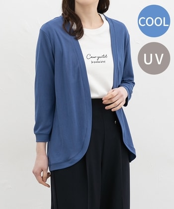 ひんやり快適『ハニさら』カーデ【デザイン】さっと羽織れるボタンレスのシンプルデザイン。ゆったりめの幅とヒップまで隠れる丈感で体型もカバー。【素材・機能】環境に優しい再生ポリエステルを使用した、さらっとした肌触りのレーヨン混素材。ひんやり快適な『接触冷感』と、紫外線対策ができる『UVカット』に、今年はさらに外からの熱を遮断する『遮熱』の機能をプラスしてバージョンアップさせた『ハニさら』アイテム。薄手で軽く、バッグに入れての持ち歩きにも便利。【スタイル】スカート・パンツはもちろん、ワンピースにも好相性。普段使いにもオフィスでの冷房対策にも、幅広く大活躍。 ●商品サイズ(cm)[M]バスト100・身丈68・袖丈45・肩幅38[L]バスト106・身丈70・袖丈46・肩幅39[LL]バスト112・身丈72・袖丈46・肩幅41[3L]バスト118・身丈74・袖丈46・肩幅42※サイズにつきましては若干の誤差が生じる場合がございます。予めご了承ください。※モデル着用サイズ:Mサイズ※8分袖 ●品質/表地 レーヨン 77%・ポリエステル 23%・別布 レーヨン 77%・ポリエステル 23%■バングラデシュ製 ●商品サイズ(cm)サイズ,バスト,身丈,袖丈,肩幅M,100,68,45,38L,106,70,46,39LL,112,72,46,413L,118,74,46,42