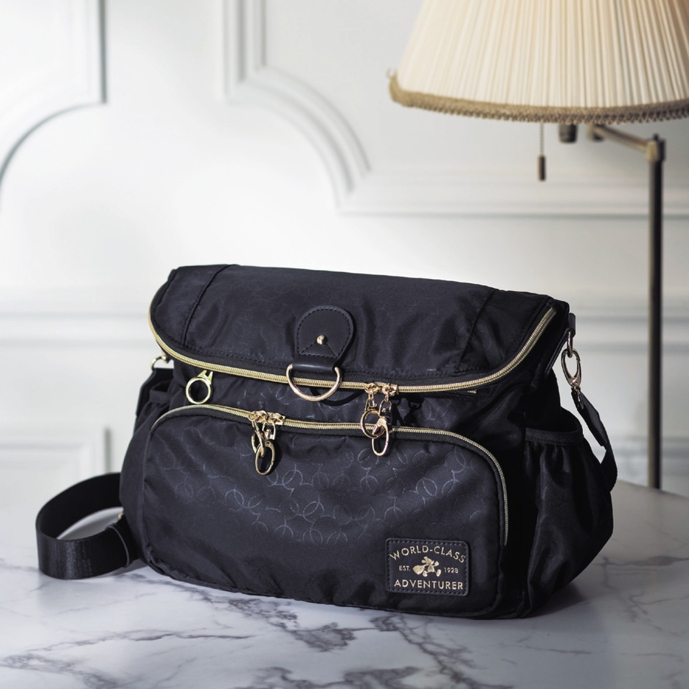 ーデザイン・スタイリングー・ミッキーモチーフを型押しでモノグラム風に表現・さり気ないデザインが大人っぽくてシック・ベルトを掛け替えることでフォルムが変化・リュックにもショルダーバッグにもなる2WAY仕様ー機能ー・メイン室と前ポケットのファスナーはスライダーロック機能付き・メイン室のファスナーは大きく開いて使いやすい・背面にもポケットあり・キャリーバッグに固定できて旅行にも便利