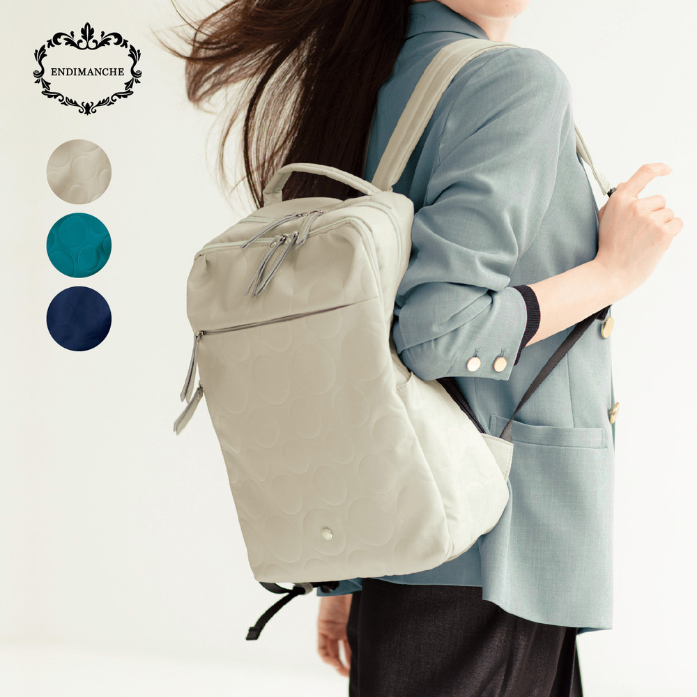 ―デザイン・スタイリング―・お仕事にもお出かけにも使えるシンプルなリュック・サッと前に回して必要な荷物が出し入れできる充実した外ポケットが特徴・背中にはメイン室に続く直結ファスナー付き・肩ひもはカーブさせて肩にフィットしやすく、ずり落ちにくい仕様・A4書類を収納可能―素材―・荷物をたっぷり入れることを考えた軽やかなナイロン素材・無地とサークルエンボス柄をご用意・内生地はカラフルな配色使いENDIMANCHE(アンディマンシェ)働く女性の通勤シーンで頼りになる機能とデザイン性を備えた、ベルメゾンオリジナルのバッグブランド。1684名の働く女性にアンケートを実施して得たリアルなニーズから、「理想の通勤バッグ」を形にしています。