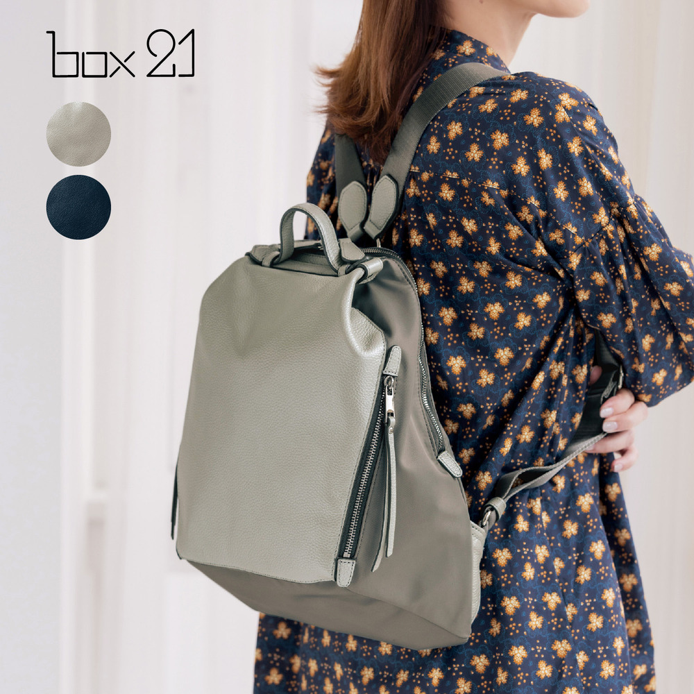 ―デザイン・スタイリング―・きれいめ、カジュアル、様々なスタイルにも合うリュックサック・本革×ナイロン素材のコンビデザイン・シンプルながら多収納で小物も迷子になりにくい―素材―・シボの美しい牛革に丈夫なナイロンをコンビ使い―機能―・メイン室はファスナーで大きく開くので荷物の出し入れがスムーズ・ポケットも充実しているのでスマートフォンやお財布などの小物を仕分け収納可能・背面ポケット付きで、リュックを背負ったまま荷物の出し入れもできますボックス21/box21さりげない可愛らしさを大切にする女性に向けて、デイリーユーズに最適な機能性と、気負わず持てるシンプルなデザインで、本格的なレザーグッズを提案するブランド。