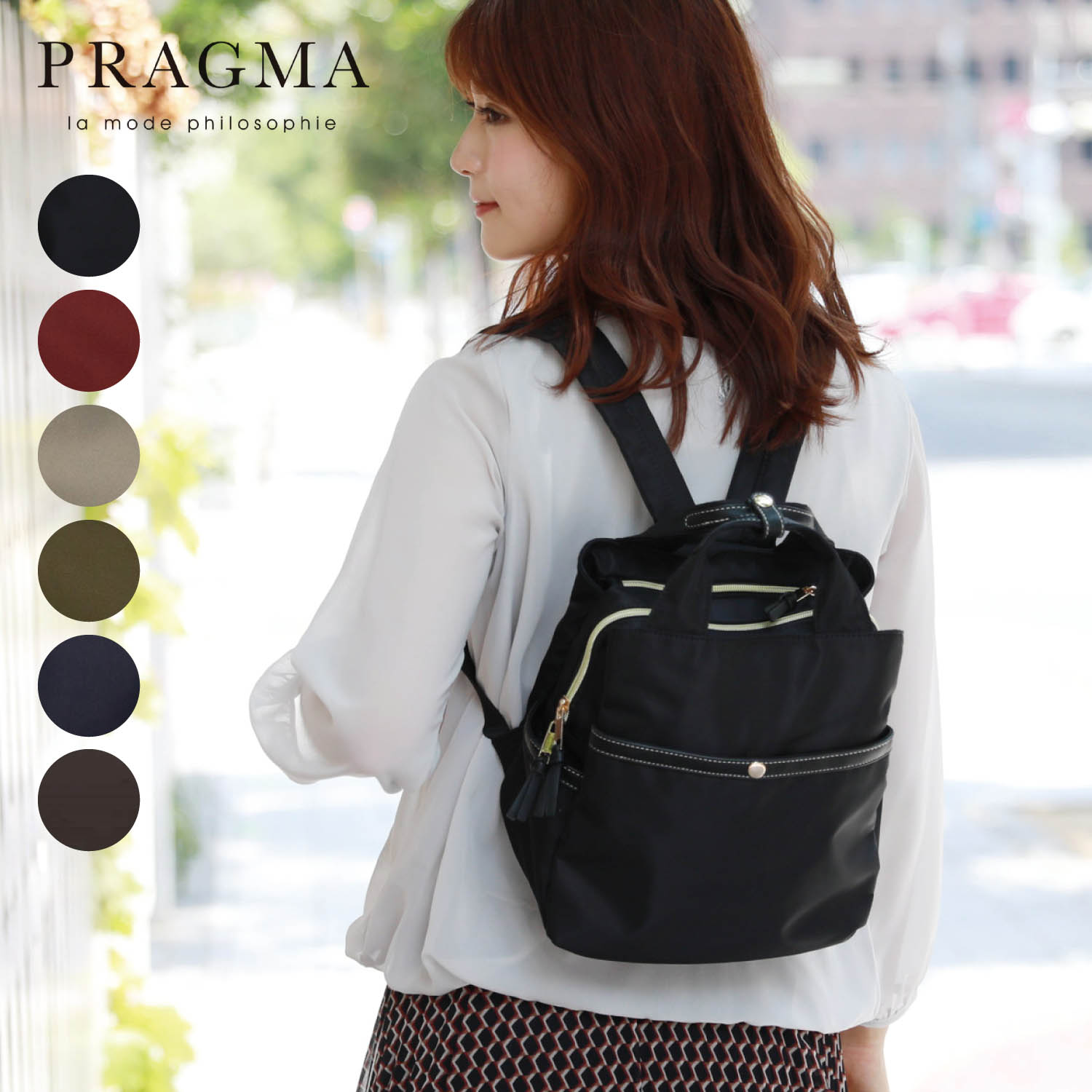 ―デザイン・スタイリング―・合皮素材の切替えで洗練された大人な印象にコーデになじむシンプルなデザイン―素材―・女性らしさを演出するツヤのあるナイロン生地を使用・ゴールドカラーのパーツでリュクスな雰囲気をプラス―機能―・メイン収納口は大きく開き荷物の出し入れがスムーズ・内外には小物の収納に便利なポケットを多数配置・肩に負担がかかりにくい、うれしい軽量設計のリュックサックです。プラグマ/PRAGMA「大人のエレガンス」をテーマに、デザイン性と実用性を備えた「考えるファッション」を提案します。ブランド名は、哲学用語のpragmatism(実用主義・道具主義)に由来しています。