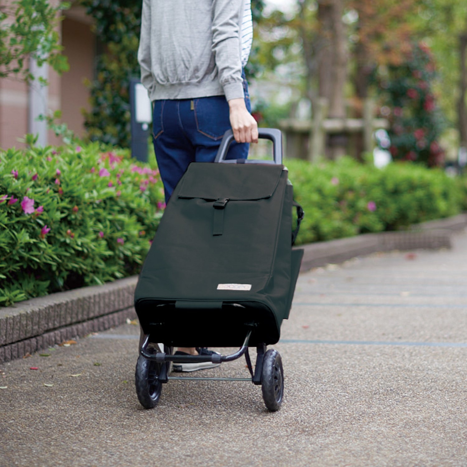 スーパーマーケットでのお買い物にはもちろん、レジャーにも連れて行きたいバッグとカートのセットですバッグは40リットルの大容量で、内側はアルミ蒸着フィルム仕様背面にはポケットとファスナーポケット、サイドには傘用ポケットが付いていますバッグにはサイドハンドル付き。階段などで持ち上げて運ぶ際に役立ちます。カートフレームスチールの大きめの車輪は移動しやすく、フックには手持ちのバッグを提げることもできますカートを使わないときは、折りたたんでコンパクトに収納可能