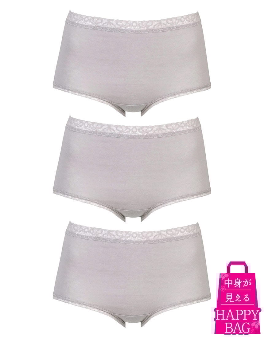 お得な福袋〜Happy Bag〜【ウイングのデイリーショーツ(ベーシックショーツ)3枚】が入ったお得なセット!数量限定なので、お早めにどうぞ!!●やさしい肌あたり 脇に縫い目がないフラットな仕様、ウエストと裾は肌あたりのよいレースを使用●ここちよいフィット感 身生地部は、ストレッチ性とフィット感のよい綿混素材・はきこみ丈:ふかめ(深ばき)※商品画像はあくまでイメージです。※ご注文が集中した場合、注文状況が<在庫有り>と表示されていても完売となる場合がございます。※商品によってハンガーが付いているもの、ないものが混在している場合がございます。※こちらの商品につきましては、お客様のご都合による返品や交換は承っておりません。予めご了承ください。※ハッピーバッグ(福袋)のご注文はお一人様10点までになります。