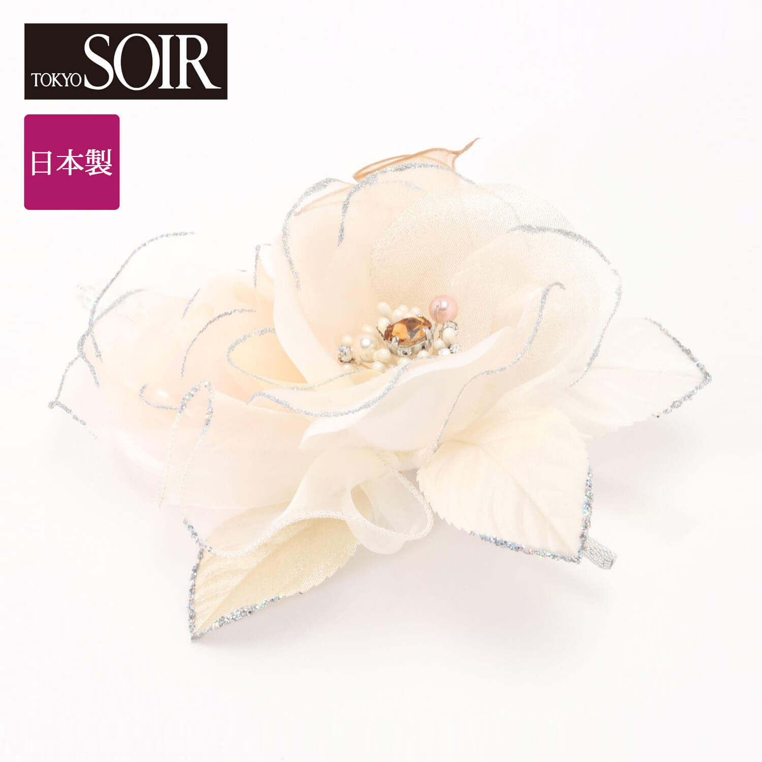 ―デザイン・スタイリング―・装いを華やかに惹き立てる日本製のブーケコサージュ・花びらからリーフに至るまで繊細に表現・奥行き感を演出するグラデーションカラー・煌めきをプラスするラメ使いの縁取り・ストーン風やパール調ビジューがアクセントに東京ソワール/TOKYO SOIRブラックフォーマルは東京ソワールから生まれました。1969年に『株式会社東京ソワール』となり、日本で初めて和服に変わる喪服(ブラックフォーマル)を開発。数あるフォーマルメーカーの中で唯一、オートクチュールからスタートした会社です。フォーマルウエアのリーディングカンパニーとして全国47都道府県に有名デパートやスーパーなどに合計 約1100店舗に展開中。