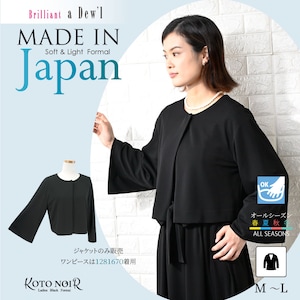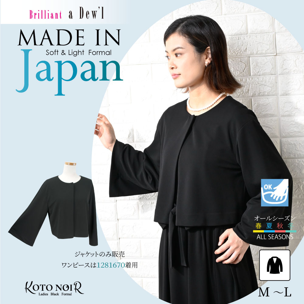 ・日本製の高級感漂うワンランク上のソフトなブラックフォーマルです。厳選した素材と熟練の職人が縫製した妥協のない品質をお届けいたします。■並んだときに差が付く極上の黒厳選した染料や深色剤で光の反射をコントロールする低屈折樹脂加工を施し、より濃く深い黒を表現しております。■高発色・高反発性ポリエステル素材「ゼログ」使用・ソフトでしなやかな肌ざわり・シワになりにくい高反撥性のある素材・上質な生地感を表現する発色性の良さ・動きやすさを追及した優れたストレッチ性・ご家庭で手洗い可能なウォッシャブル機能。■美しく優雅に揺れる、ベルスリーブ・ボレロ風ジャケット袖口に向かって広がるベルスリーブが、手元を細く美しく、計算されたボリューム感で、自然な着やせを叶えます。お顔周りをすっきりと見せるノーカラー。アクセサリーが映えるミニマルなデザインは、どんなアイテムとも相性抜群です。大きめのスナップボタン仕様で、着脱のしやすさとスマートな見た目を両立しました。喪以外のシーンにも着用いただける汎用性の広いジャケットです。ご家庭での手洗いが可能です。