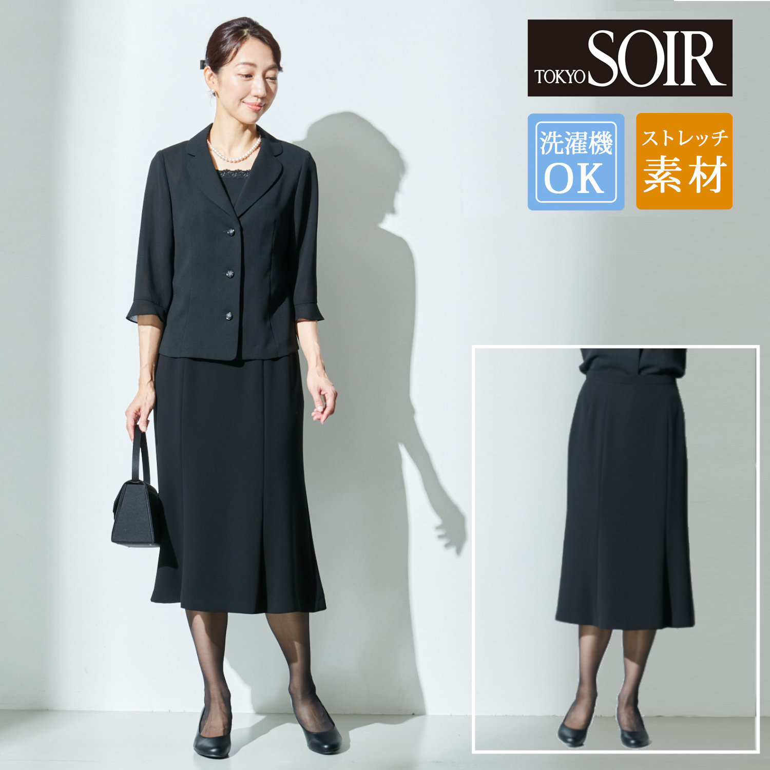 ―デザイン・スタイリング―・上品なセミロング丈のブラックフォーマルスカート・女性らしいラインに魅せる曲線的なシルエットと裾のフレア感が◎・正座や着席する際にも足元が気になりにくい・両サイドゴム仕様でラクなはき心地・冠婚葬祭はもちろん、学校行事など様々なシーンで活躍してくれる1枚―素材―・ご家庭の洗濯機で洗えるので、お手入れもラクチン・動きやすいストレッチ性のある素材を採用・通年着用いただけます東京ソワール/TOKYO SOIRブラックフォーマルは東京ソワールから生まれました。1969年に『株式会社東京ソワール』となり、日本で初めて和服に変わる喪服(ブラックフォーマル)を開発。数あるフォーマルメーカーの中で唯一、オートクチュールからスタートした会社です。フォーマルウエアのリーディングカンパニーとして全国47都道府県に有名デパートやスーパーなどに合計 約1100店舗に展開中。#フォーマル#ブラックフォーマル#お別れの会#お宮参り#七五三#冠婚葬祭#セレモニー#礼服#喪服#レディース#60代#50代 #40代
