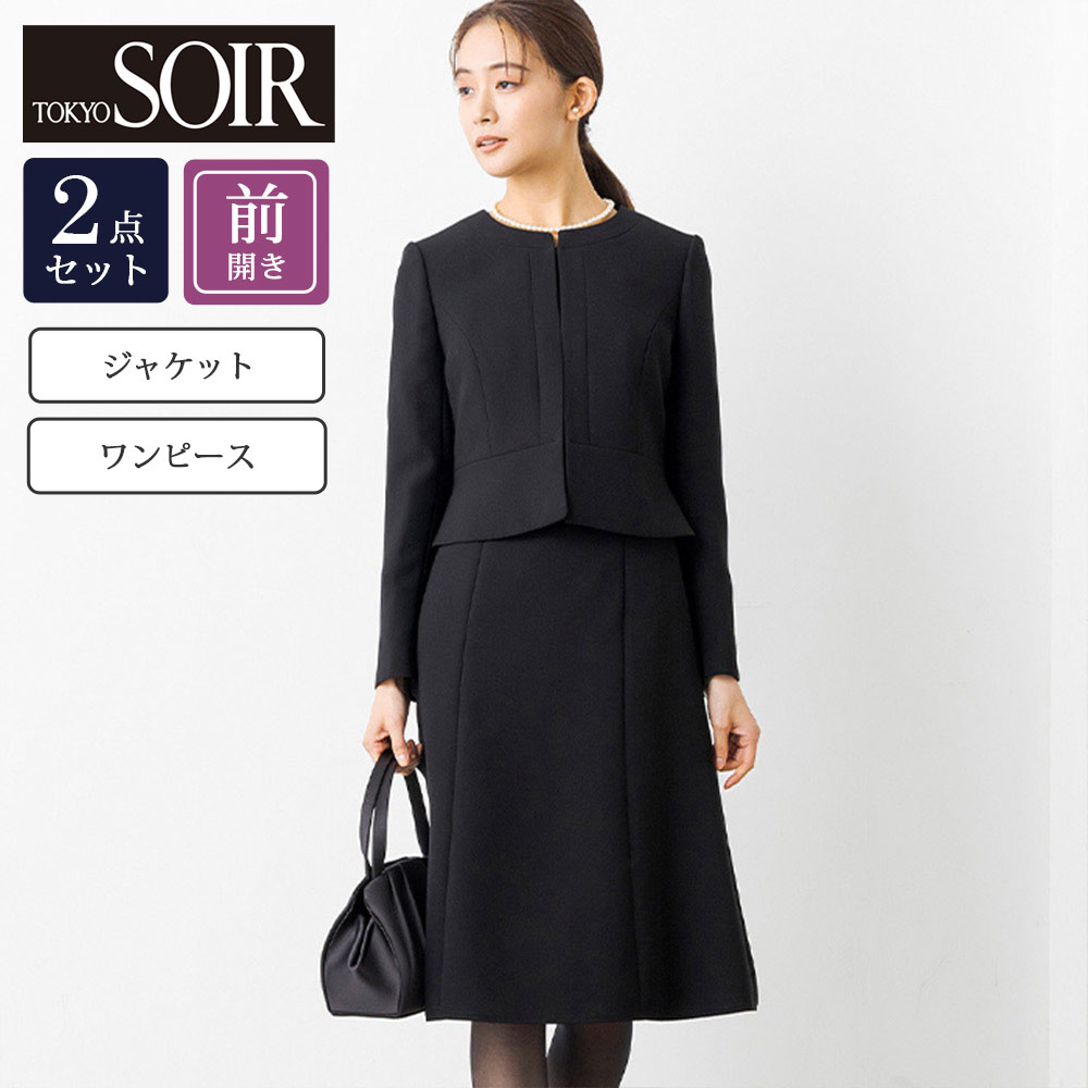 【2点セット】ジャケット/セパレート風ワンピース▼ジャケット・凛とした漆黒のジャケット・少し立ち上がったスタイリッシュなスタンドカラー・さり気ないアクセントを添えるフェイクボタン・フロントは2箇所のカギホック留め・年代を問わず長く愛用できるシンプルなデザイン・季節を問わず着られるので、いざという時に重宝▼セパレート風ワンピース・ジャケットを羽織っているようなデザイン・脱ぎ着がしやすいフロントオープンタイプ・エレガントな印象を演出するフレアシルエット・年代を問わず長く愛用できるシンプルなデザイン・季節を問わず着られるので、いざという時に重宝―スタッフ着用コメントー・ワンピースは全体的に細身なサイズ感です。特にバストとヒップが少し窮屈に感じました。グラマーな方はワンサイズ上をおすすめします。・ワンピースのウエスト部分が細身な作りとなっているので、着脱時にはお化粧などにご注意ください。(今回着用:9ARサイズ、身長:149cm、体型:普通、普段着用:Mサイズ)-----------伸縮性:なし生地の厚さ:普通質感:さらっとしているサイズ感:ややタイト推奨季節:春夏秋冬-----------東京ソワール/TOKYO SOIRブラックフォーマルは東京ソワールから生まれました。1969年に『株式会社東京ソワール』となり、日本で初めて和服に変わる喪服(ブラックフォーマル)を開発。数あるフォーマルメーカーの中で唯一、オートクチュールからスタートした会社です。フォーマルウエアのリーディングカンパニーとして全国47都道府県に有名デパートやスーパーなどに合計 約1100店舗に展