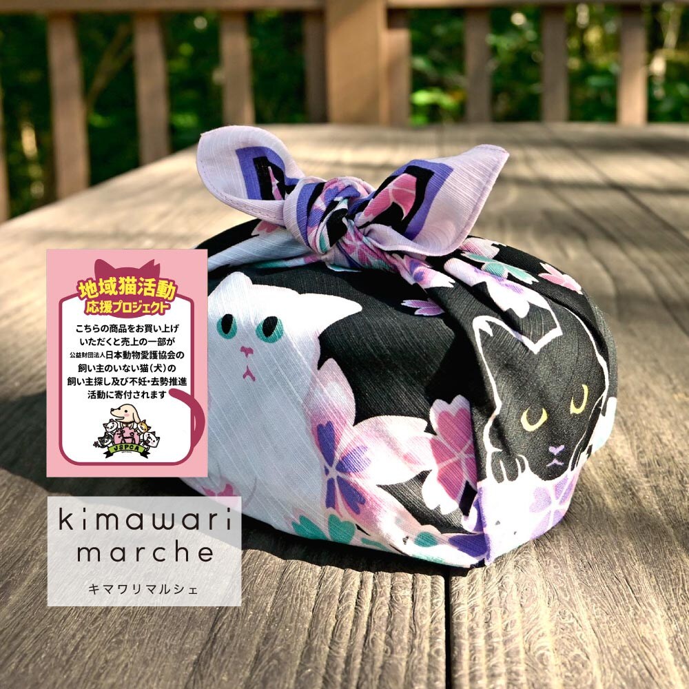 ふろしきを購入して地域猫活動を応援。売上の一部が「日本動物愛護協会」へ寄付されます。「癒し」と「優しさ」をテーマに可愛い猫たちをデザインしたふろしき。スカーフにも使用されている透け感のある涼しげで丈夫な生地を使用。大判サイズでファッションアイテムやクッションカバー、エコバッグとしてもお使いいただけます。テーブルクロスやクッションカバー、暖簾のような目隠しなどのインテリアとしても活用できます。綿100%で洗濯機で丸洗いが可能です。※無地物と分けて洗濯してください。 1回目は糊がついているので若干硬く感じられますが、洗って繰り返し使うと柔らかく使いやすくなります。〈地域猫活動とは〉「地域猫」とは地域住民の合意のもと、不妊去勢手術・耳先にV字のカットを施してある飼い主のいない猫のこと。カットされた耳が桜の花びらのように見えることから「さくらねこ」とも呼ばれます。住民やボランティアなどが給餌やトイレを共同管理して見守ることで猫によるトラブルを減らし、住みよい地域社会をつくっていく事を目的とした活動です。【古き良き伝統に、新しい価値を創造】京都にある創業70年の和装小物メーカー・三陽商事は、人と猫が幸せに共存できる社会を目指す"地域猫活動"を応援。プロジェクト商品の売上の一部は、全国各地の地域猫活動を支援されている『公益財団法人日本動物愛護協会』へ寄付されます。