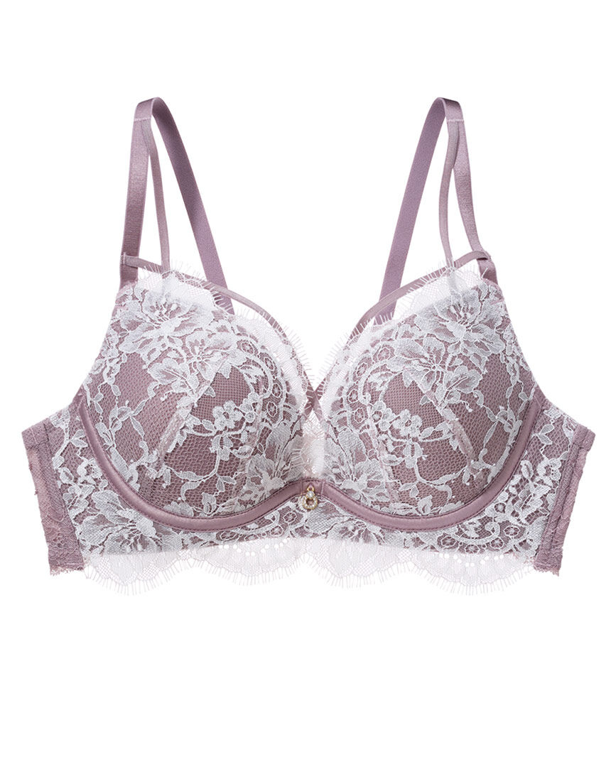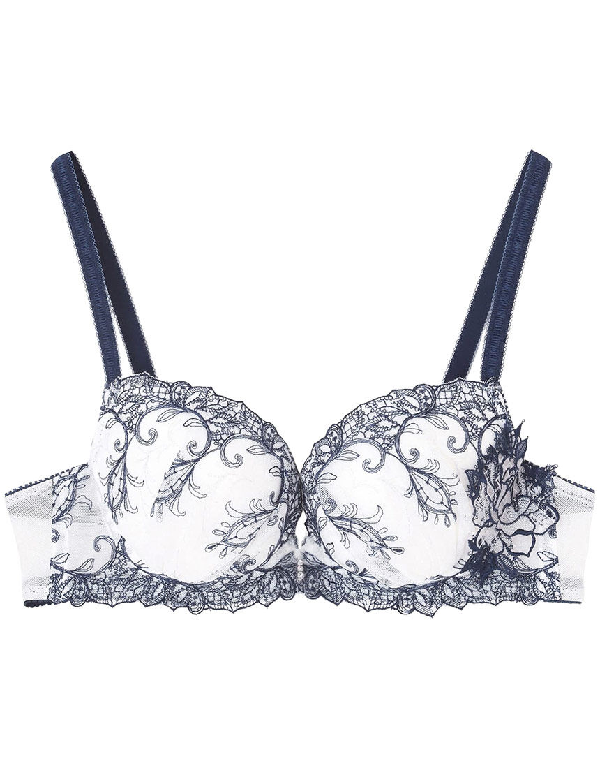 妖艶な孔雀の羽をモチーフにした、ラメラインが繊細に彩るレースが特徴的なブラジャーです。華やかさと繊細さが絶妙に融合し、上品でエレガントな雰囲気を漂わせます。さらに、バラと葉のアップリケモチーフが加わることで、より一層華やかな印象を与え、ラグジュアリーで洗練された世界へと誘います。ギャザー仕上げのカップデザインは、立体感を生み出し、モチーフの柔らかなラインで描かれたバラがキュートさを引き立てます。そのディテールは、どの角度から見ても美しく、魅力を一層引き立てます。