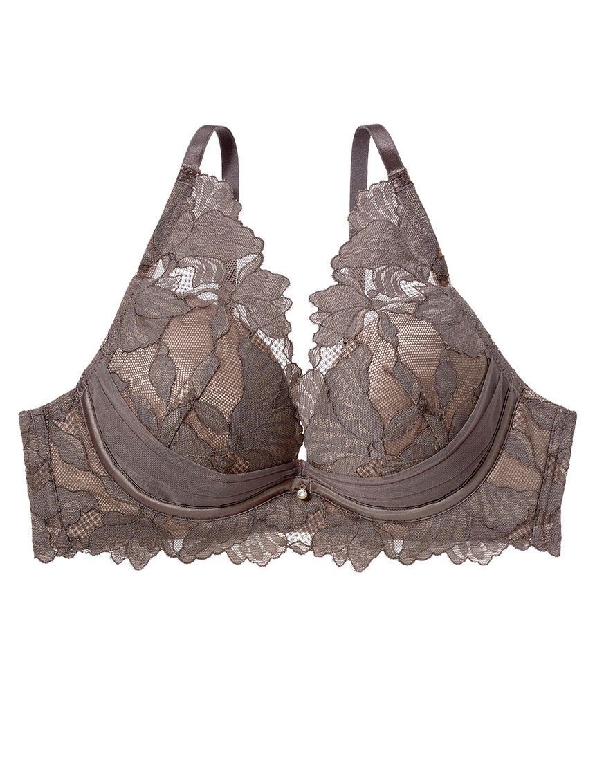 カップ全体に咲き誇る大胆な花柄をレースで表現しました。華やかさと高級感のあるシリーズです。エレガントコレクションのブラジャーならではの脇寄せ効果で集めた胸をデコルテ部に集中メイクし脇・背中スッキリ!盛り過ぎない自然な谷間も人気です。前中心浅めのデザインなので着け心地が良く、シルエットがキレイと大好評 着けた瞬間にシルエット美人になります。豊富なサイズと自分好みのコーディネイトが楽しめるようにショーツのバリエーションもご用意しています。