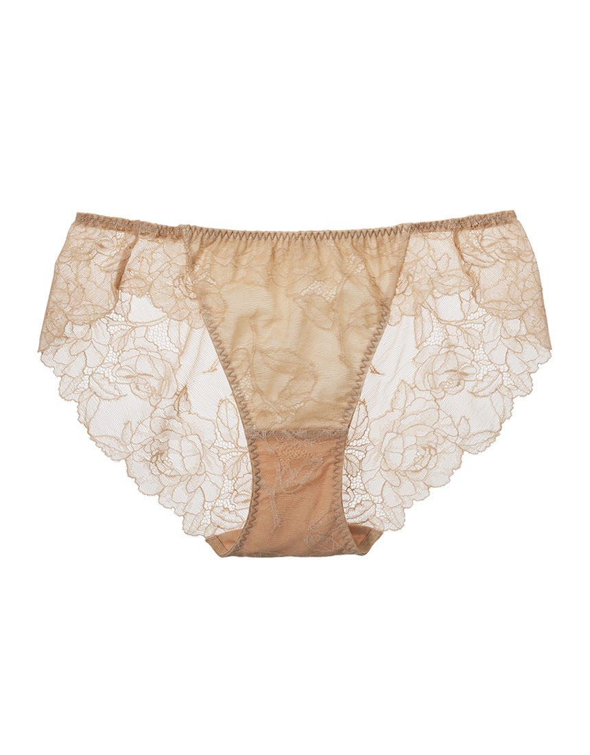【フロント】・大ぶりな花柄のストレッチレースに、薄手の生地を裏打ちして透けにくい。・ブランドネームや品質表示を裏生地にプリント。ラベルを付けていないので肌にチクチクしない。【バック】・サイドからバックにかけてはストレッチレース1枚で、脚ぐりにゴムを使わずやさしくフィット。洋服にラインがひびきにくい。【はき込み】・レギュラー(ふつう)【クロッチ】・表側はストレッチレース・肌側はコットン