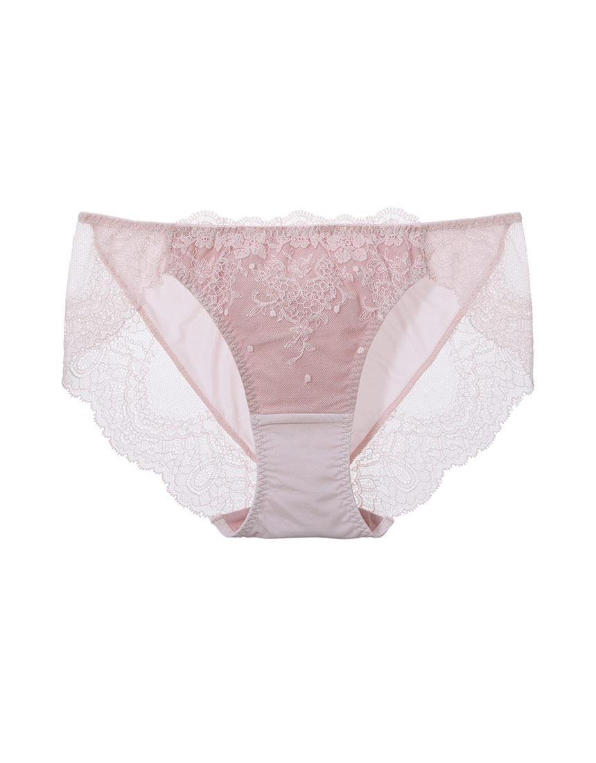 キラキラと降り注ぐ木漏れ日をイメージしたラメ糸がきらめく透明感のあるレースを使用した、ロマンティックなグループ。●フロントにレースをあしらい、裏打ち付きで透けにくい、使いやすいショーツ。●後ろ身頃は吸汗速乾の伸びのよい素材を使用し、さらっと快適。●裾にはストレッチレースをほどこし、アウターにひびきにくい。