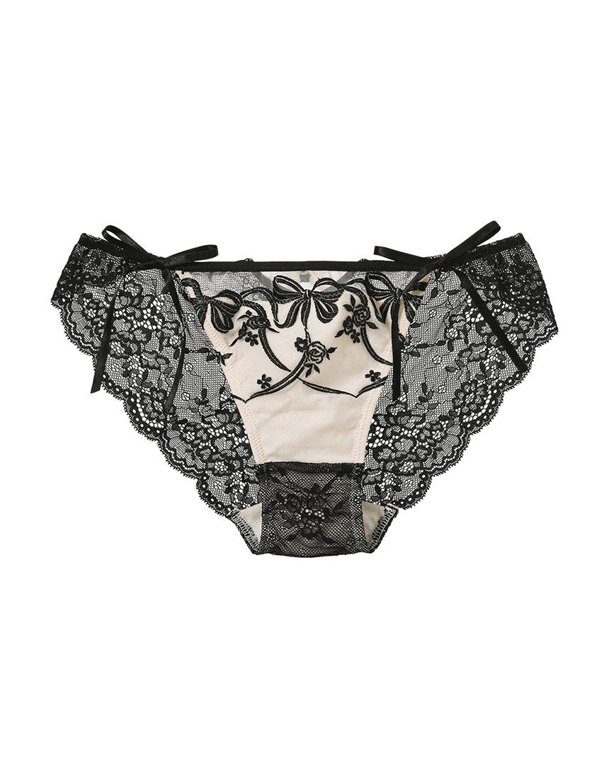 【フロント】・リボン&ローズモチーフの刺しゅうレースに、コットン生地を裏打ちして透けにくい。・上部はチュールネット1枚で、肌が透けてちょっぴりセクシー。・両サイドは自分で結ぶサテンリボンで、特別感あふれる仕様。【バック】・フロントとは異なる、伸びの良いストレッチレース1枚使い。・上部中央をV字型にカットし、チュールネットのリボンモチーフをプラス。後ろ姿にキュートなワンポイント。・脚ぐりはゴムを使わないレーススカラップで、洋服にひびきにくく軽いフィット感。【はき込み】・レギュラー(ふつう)【クロッチ】・表側はバックと同じストレッチレース・肌側はコットン