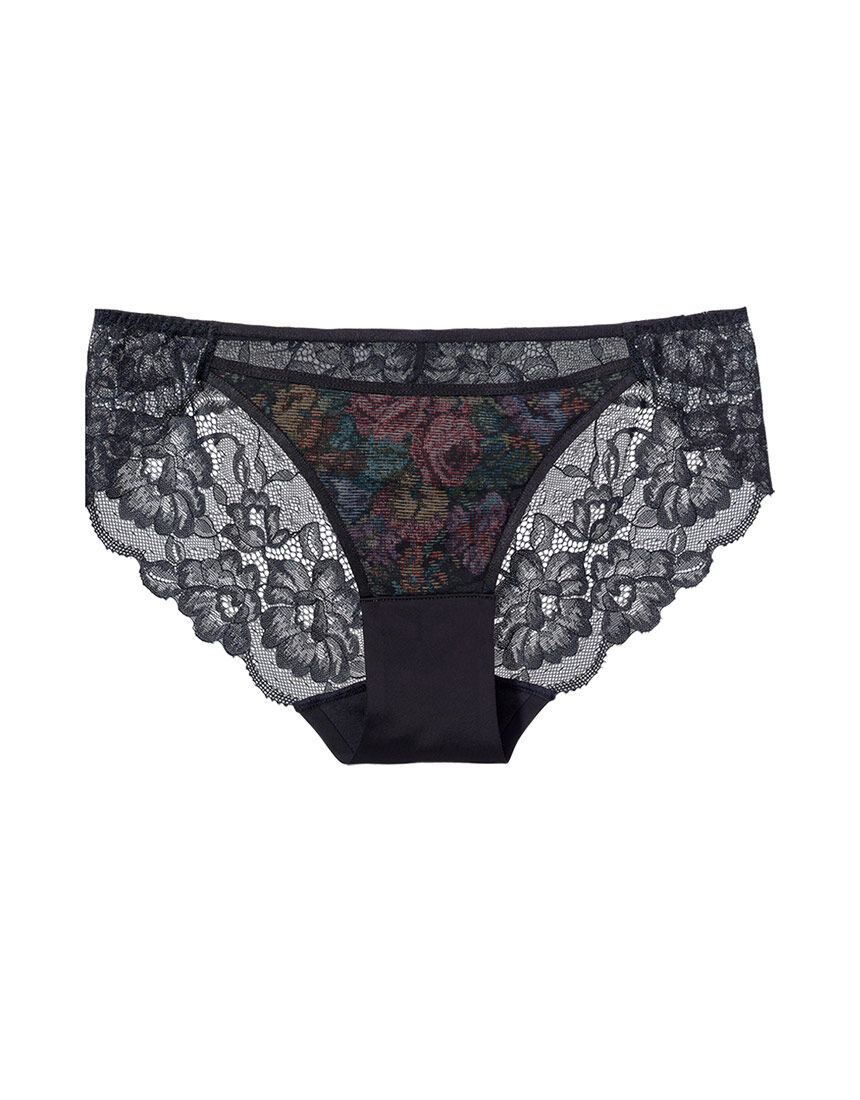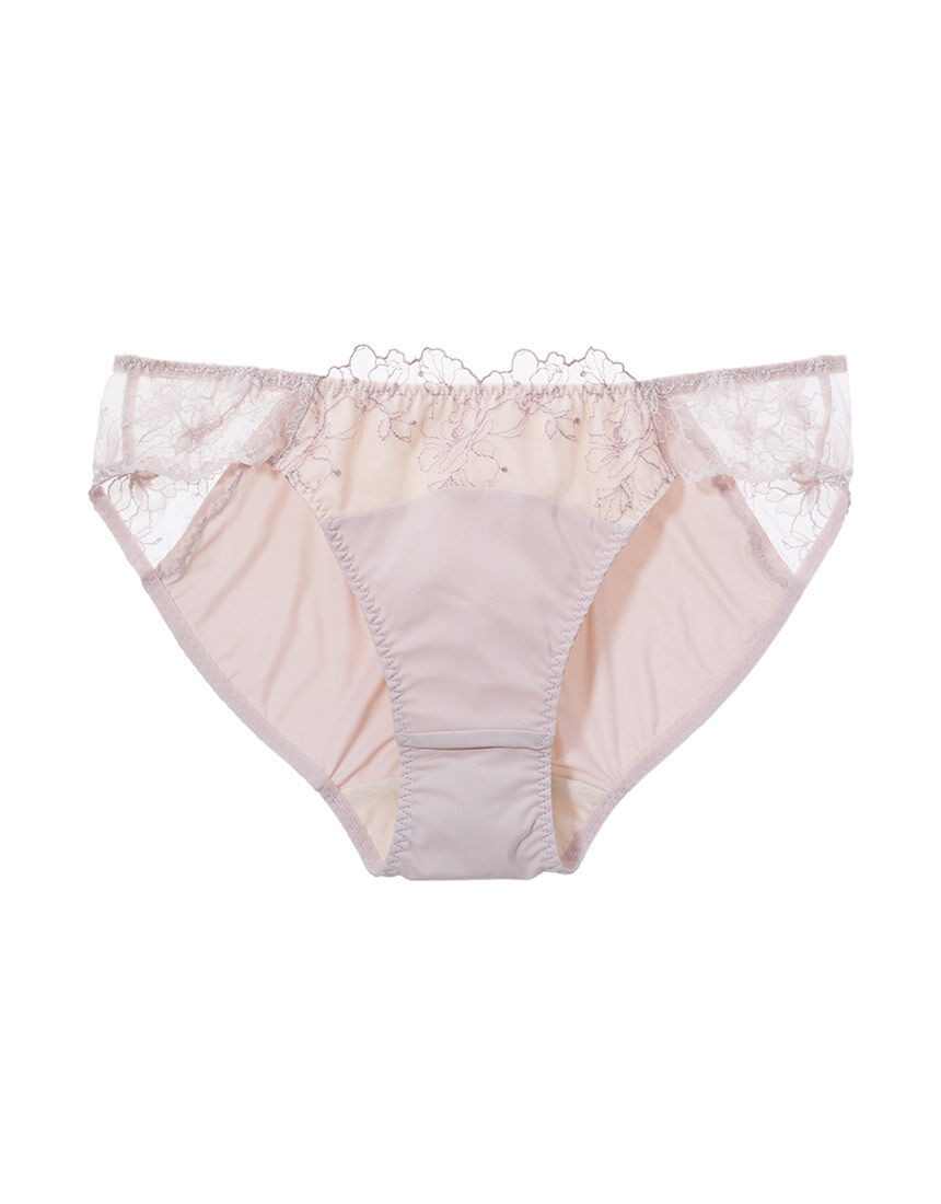 【フロント】・上部は線画調刺しゅうレース、下部はストレッチシフォンのコンビネーション。・ウエストに、レースのスカラップが繊細なラインを描く。・全体にコットン混生地を裏打ちして透けにくい。・両サイドはやや後ろ側までストレッチレース1枚使いで、肌が透ける。【バック】・なめらかな肌ざわりのストレッチ生地が、気持ちよくフィット。・上部中央に小さなオーガンジーリボンを添えて、後ろ姿にほんのり甘み。【はき込み】・レギュラー(ふつう)【クロッチ】・表側はバックと同じストレッチ生地・肌側はコットン混