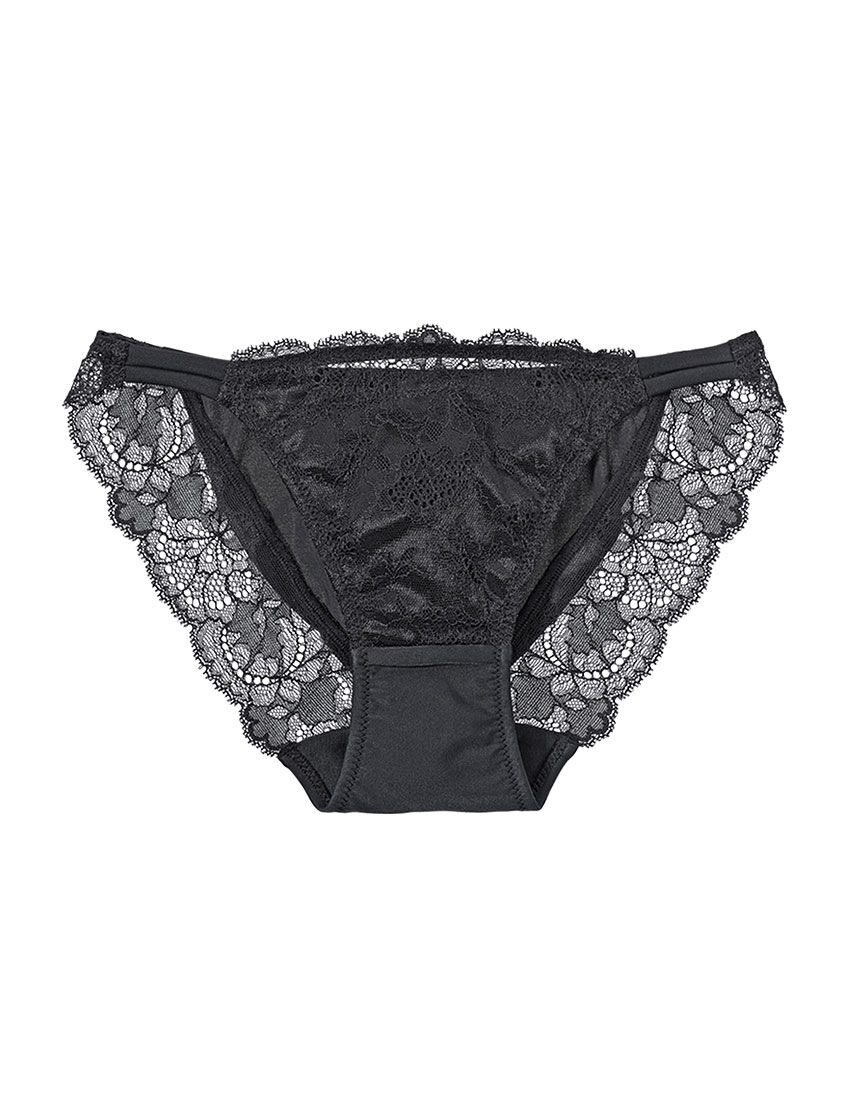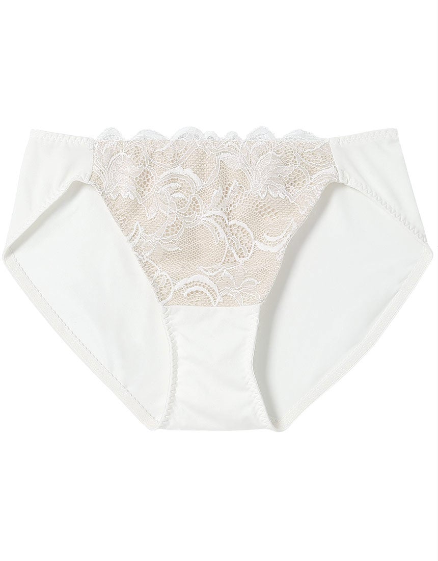 【フロント】・透け感のある編み柄の部分と、光沢のあるサテン調の部分とのコントラストが印象的なストレッチラッセルレース。・コットン混生地を裏打ちし、透けにくい仕様。・両サイドはソフトなストレッチ生地でできたテープ2本使い。【バック】・メインは肌ざわりがふんわりソフトなストレッチ生地。・脚ぐりは幅広めのストレッチレースに切り替え、やさしい肌あたり。【はき込み】・ローライズ(浅め)【クロッチ】・表側はバックと同じストレッチ生地・肌側はコットン混