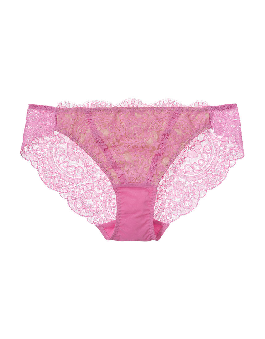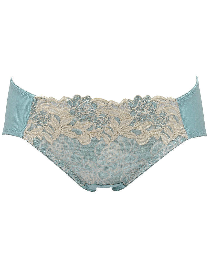 【フロント】・伸縮性のないアイラッシュレースに、配色の薄手生地を裏打ちして透けにくい。・レース下にV字型にテープをあしらって、モダンな表情。【バック】・フィット感の良いストレッチレース。脚ぐりにゴムを使わず、軽いはき心地で服にひびきにくい。【はき込み】・レギュラー(ふつう)【クロッチ】・表側はパワーネット・肌側はコットン