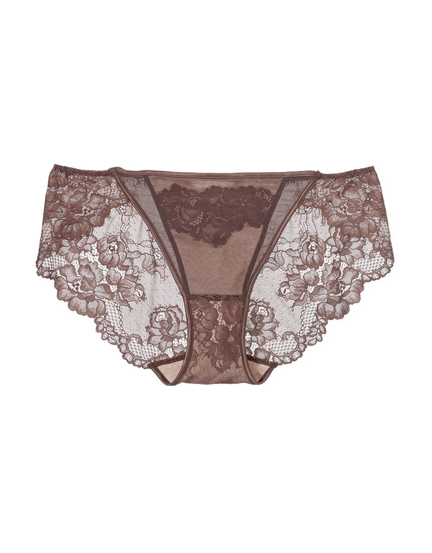 【フロント】・中央はベージュ系の生地にモチーフレースをのせ、薄手パワーネットをかぶせた仕様。ニュアンスのある透け感がスタイリッシュ。・フロントの両サイドは薄手パワーネット1枚で肌が透ける。・ウエスト・脚ぐりはストレッチサテンでパイピング。【バック】・伸びの良いストレッチレース1枚使いで透け感あり。・上部中央に三角形のホールをあけて、遊び心のあるアクセント。・脚ぐりはレースのスカラップを生かしてゴム不使用。やさしいフィット感で、洋服にラインがひびきにくい。【はき込み】・レギュラー(ふつう)【クロッチ】・表側はバックと同じストレッチレース・肌側はコットン◎フロントのレースの柄の出方は、商品により異なります。【ドラマティックな日常がはじまる。-SALON by PEACH JOHN-】ライフスタイルに上質を求める女性に向けたランジェリー、ラウンジウェアブランド。リアルユースで活躍する機能性と着心地の良さを備え、日常のルーティンをドラマティックに変える色気をプラスしてお届けします。