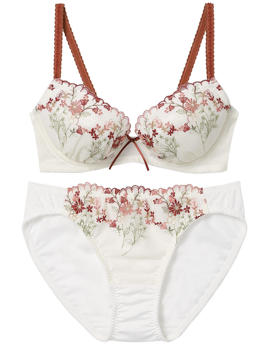 可憐な小花ブーケを多色で表現したエンブロイダリーレースが特徴的な、まる胸メイクのブラ&ショーツセット。【整える機能のブラ】自然なまるみのバストシルエットをつくるブラジャー。<自然にボリュームアップ>・3/4カップと取りはずし可能なパッドで自然に盛って、まるみバストをメイク。<脇から寄せて程よいまるみバストに>・前中心が低いワイヤーで脇からバストを寄せて、程よい谷間をメイク。<好みに合わせて調節可能>・取り外し可能のパッドでバストの大きさの左右差や、胸の張りなどの状態に合わせてカップボリュームの調整可能。・ストラップはアジャスター付きで、体型や身長に合わせて長さ調節可能。・後ろホックは調節付きで、体型や体調に合わせて調節可能。●前中心のリボンがポイントです。●ショーツのフロントにもレースをほどこしました。※ショーツMサイズ:Bカップ(アンダー65-75)、C-Eカップ(アンダー65・70)※ショーツLサイズ:C-Eカップ(アンダー75)【ショーツ】洗濯方法:洗濯機可素材:ポリエステル、ポリウレタン