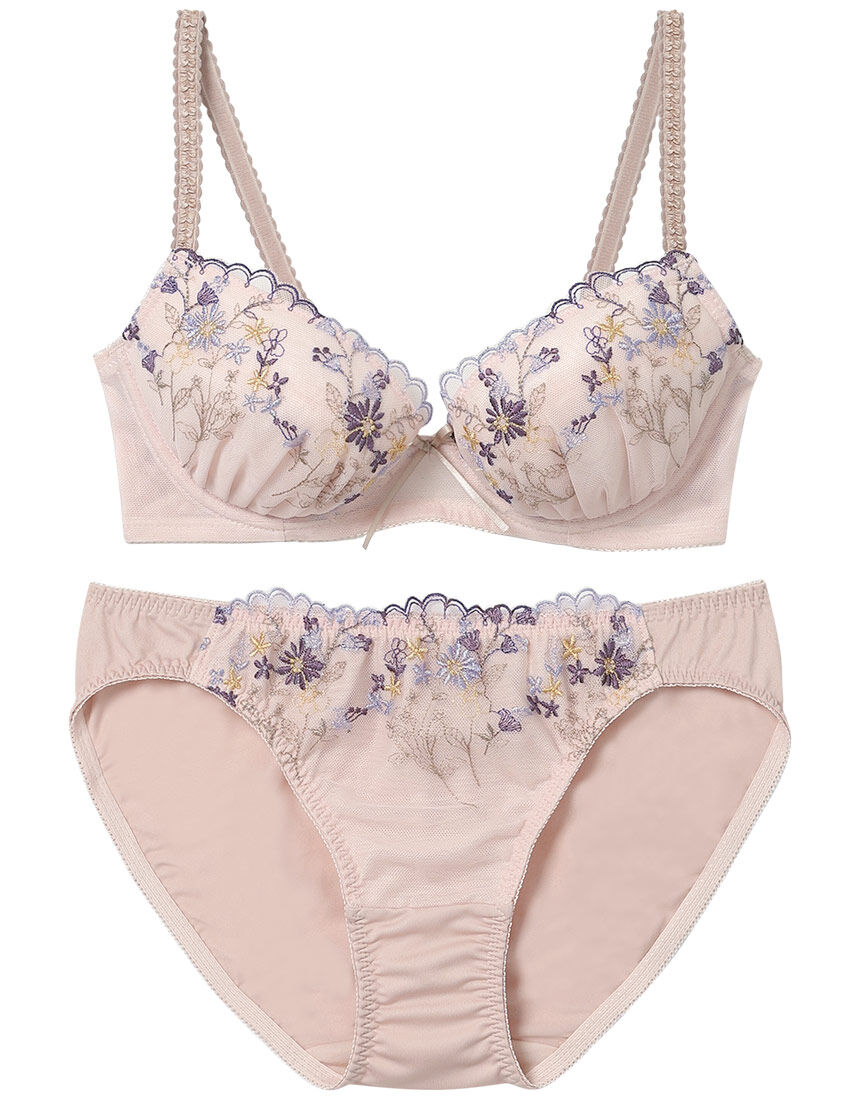 可憐な小花ブーケを多色で表現したエンブロイダリーレースが特徴的な、まる胸メイクのブラ&ショーツセット。【整える機能のブラ】自然なまるみのバストシルエットをつくるブラジャー。<自然にボリュームアップ>・3/4カップと取りはずし可能なパッドで自然に盛って、まるみバストをメイク。<脇から寄せて程よいまるみバストに>・前中心が低いワイヤーで脇からバストを寄せて、程よい谷間をメイク。<好みに合わせて調節可能>・取り外し可能のパッドでバストの大きさの左右差や、胸の張りなどの状態に合わせてカップボリュームの調整可能。・ストラップはアジャスター付きで、体型や身長に合わせて長さ調節可能。・後ろホックは調節付きで、体型や体調に合わせて調節可能。●前中心のリボンがポイントです。●ショーツのフロントにもレースをほどこしました。※ショーツMサイズ:Bカップ(アンダー65-75)、C-Eカップ(アンダー65・70)※ショーツLサイズ:C-Eカップ(アンダー75)【ショーツ】洗濯方法:洗濯機可素材:ポリエステル、ポリウレタン