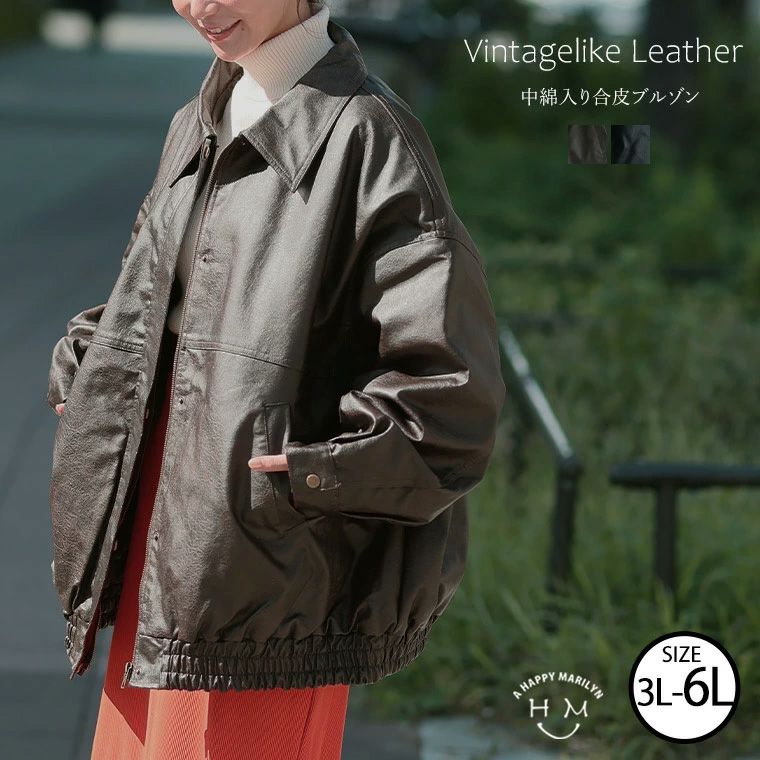 ■ゆるサイズで着る 合皮 中綿入り ブルゾン レザーライク レザー フェイクレザー ヴィンテージレザー 大きいサイズの通販ならハッピーマリリン(5900円以上購入で送料無料)
