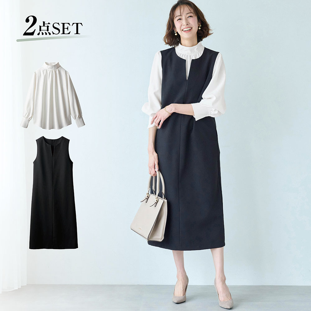 【2点セット】ジャンパースカート/ハイネックブラウス▼ジャンパースカート・抜け感がありつつ、上品見えするジャンパースカート・縦にストンと落ちるIライン効果ですっきり見え・襟元は肩部分がずれにくく、程よい抜け感が素敵なキーネックデザイン・やや厚手のダブルクロス素材・使い勝手のよいポケット付き▼ハイネックブラウス・ジャンパースカートと相性抜群のハイネックブラウス・ブラウスも透けにくい、薄手のダブルクロスを採用・単品でも着回ししやすいデザイン・襟元にギャザーをあしらい、立体感のあるシルエットに・袖口はやや長めのカフスが今っぽく、少し折り返して着用しても◎・後ろは肌が見えにくいボタン開きなので、後ろ姿も安心Style Note(スタイルノート)2000年のデビュー以来、長きにわたりご好評を頂いている ベルメゾンのオリジナルブランド。トレンドを適度に取り入れながら、素材・仕立て・シルエットに至るまで、大人の女性にふさわしいクオリティを追求し、お洒落が楽しくなるスタイルをお届けします。