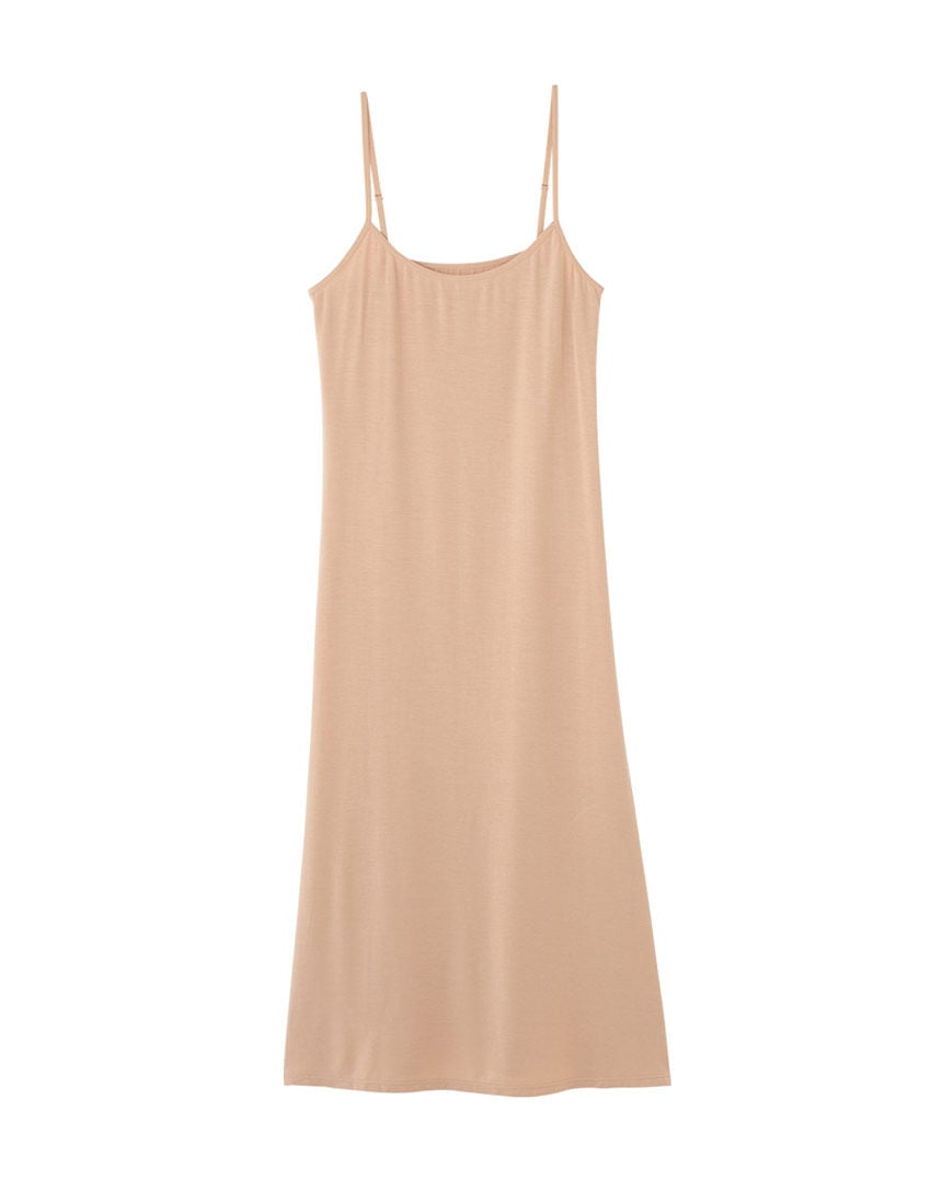 【おすすめポイント】・下着の透けや、ライン映りを防ぐシンプルなスリップ。・ロングワンピースや、ロングスカートに合わせやすいミディ丈。・肌ざわりが良く伸縮性の高い生地を使用し、快適な着心地。・洋服から透けたりチラ見えしても、下着っぽくないシンプルなデザイン。・キャミソールとペチコートを別々に合わせるより、シルエットがすっきりきれい。【こんな人、こんな時に】・透けやすい色・素材の服のインナーとして。ペチコートの代わりにも・下着や体のラインが映りやすい薄手の服を着るときに・スカートのまとわりつき防止に【デザイン】・フロントは広くあいたラウンドネック、バックは水平のライン・上半身はタイトすぎないフィットシルエット。腰から下は少し裾広がりのフレア・ロングスカートにぴったりな、ひざ下のミディ丈・ストラップはアジャスター付きで調節可能【素材】・とろみのある柔らかな肌ざわりが心地よい、レーヨン混ストレッチ生地・伸縮性が高いので、動きやすく快適
