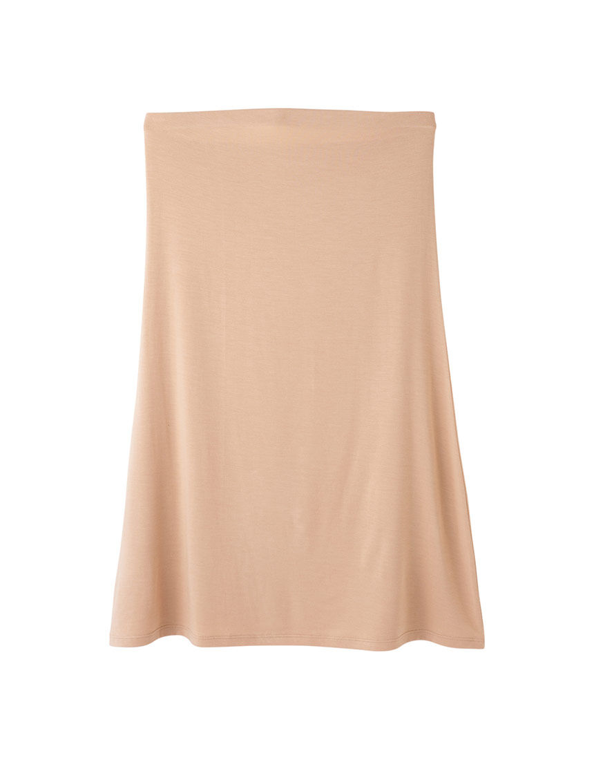 【おすすめポイント】・シアー素材の服を着る時に、下着やボディラインの透けを防止できるスリップ。・チューブ型だから、オフショルダーやキャミドレスなど、肩を見せる服もOK。・ネックラインなどからチラッとのぞいても、下着っぽく見えないシンプルなルックス。・肌ざわりがなめらかでストレッチ性があり、着心地快適。【こんな人、こんな時に】・シフォンやレースなどのシアー素材、白・淡色など、透けが気になる服に・薄手の生地やタイトシルエットなど、下着のラインが気になる服に・肩を出すデザイン、ネックまわりやアームホールが広くあいた服に【デザイン】・肩ひものないチューブ型。上辺に一周、幅広ゴムテープをくるみ込んでズレ落ちを防止。肌に直接ゴムが触れない仕様・上辺は表に縫い目が見えない仕立てで、チラ見えしても下着っぽくない印象・胸元はフィット、ウエストから裾にかけて少しだけ広がるシルエット。タイトすぎずほど良くボディに沿う・太もも半分くらいの丈で、幅広いデザインのワンピースやスカートに合わせられる【素材】・しなやかで肌ざわりが良いレーヨンベア天竺・落ち感が良いのでもたつかず、シルエットがきれい・ストレッチ性もあり、動きやすく快適