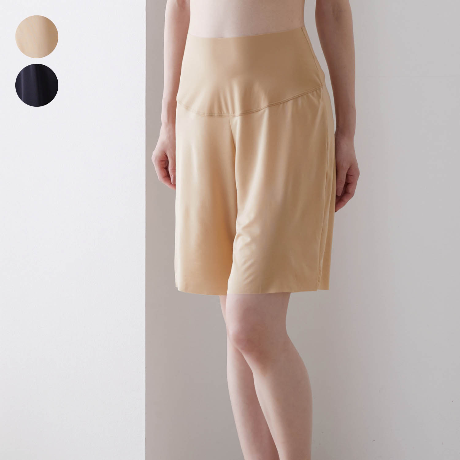 ―デザイン・スタイリング―・アウターにぎびきにくいすっきりシルエット・ワンピース下やフレアパンツ下にもおすすめ・ひざ下丈だから、ひざ裏の汗までケアできる―機能―・ウエスト部溶着ベアスムースカットオフでひびきにくく、すっきりキレイ・下着の透けはもちろん、太ももの擦れや汗ベタも防止・ウエストはゴムがなく、楽な切りっぱなし仕様―素材―・薄くて軽いサラッとしたドライ素材・生地端は切りっぱなしでラインがひびきにくい