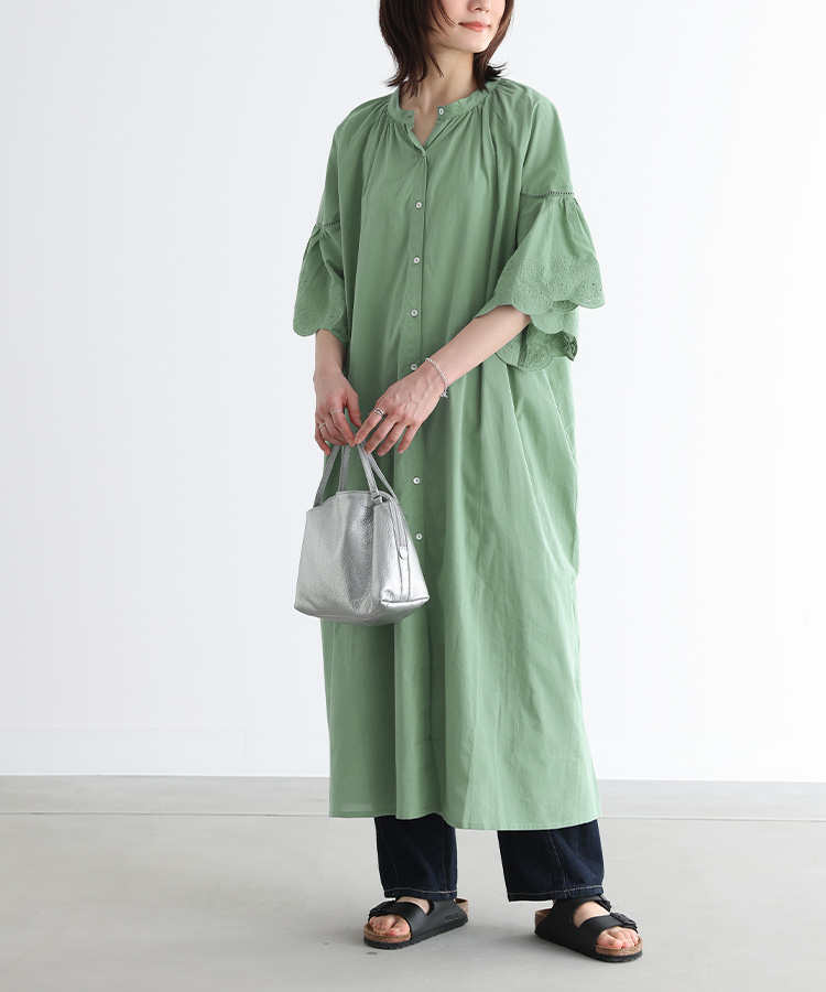 デザインスカラップ刺繍生地と梯子レースで切り替えた袖がポイントのワンピース。ひらっとしたフレアスリーブが印象的な一枚です。ノーカラーで首元すっきり 前後襟ぐり下にはギャザーを入れ、身体に張り付かず快適にご着用いただけます。 素材柔らかく軽い着心地のコットン100%生地。ナチュラルな風合いのインド綿です。透け感のある生地で、風通しが良く清涼感のあるアイテム。 ディテール・両脇シームポケット付き・ナチュラルな貝ボタン コーディネート透け感を活かしたレイヤードコーデをお楽しみいただけます。ペチコートやワイドパンツなどと合わせて、デイリーに着回せるアイテム。ボタンを開けて羽織りとしてもご着用いただけます。 スタッフ試着データ【フリーサイズ】袖丈:ちょうどひじが隠れる位着丈:くるぶし上10cm位腕周り:ゆったりバスト:ゆったりウエスト:ゆったりヒッ