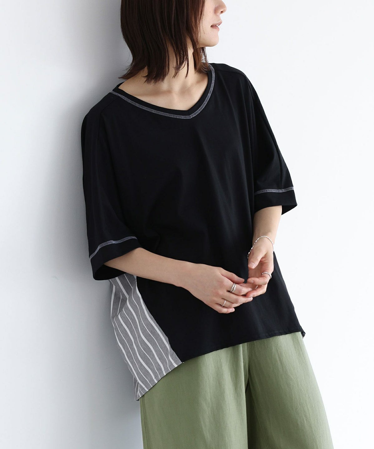 デザインカットソー生地とストライプ柄生地を切り替えた、異素材デザインTシャツ。中心に向かってタックをとったバックデザインが印象的に。ストライプ柄生地を前振りに切り替え、スタイルアップも 襟ぐりと袖口の切り替え部分に、ストライプ柄と同じ配色のステッチを入れてポイントにしました。 素材程よい薄さで触りの良いカットソー生地に、さらっとした落ち感のあるストライブ生地をドッキングしました。 コーディネートカジュアルなパンツやデニムと合わせてお洒落が完成。デザインのあるトップスなので、シンプルなボトムスと好相性です。 スタッフ試着データ【フリーサイズ】袖丈:ちょうどひじが隠れる位着丈:ヒップがすっぽり隠れる位腕周り:ゆったりバスト:ゆったり全体:ゆったり全体的にゆるっと素敵に着られました。【フリーサイズ】袖丈:ひじ下3cm位着丈:太もも真ん中より上位腕