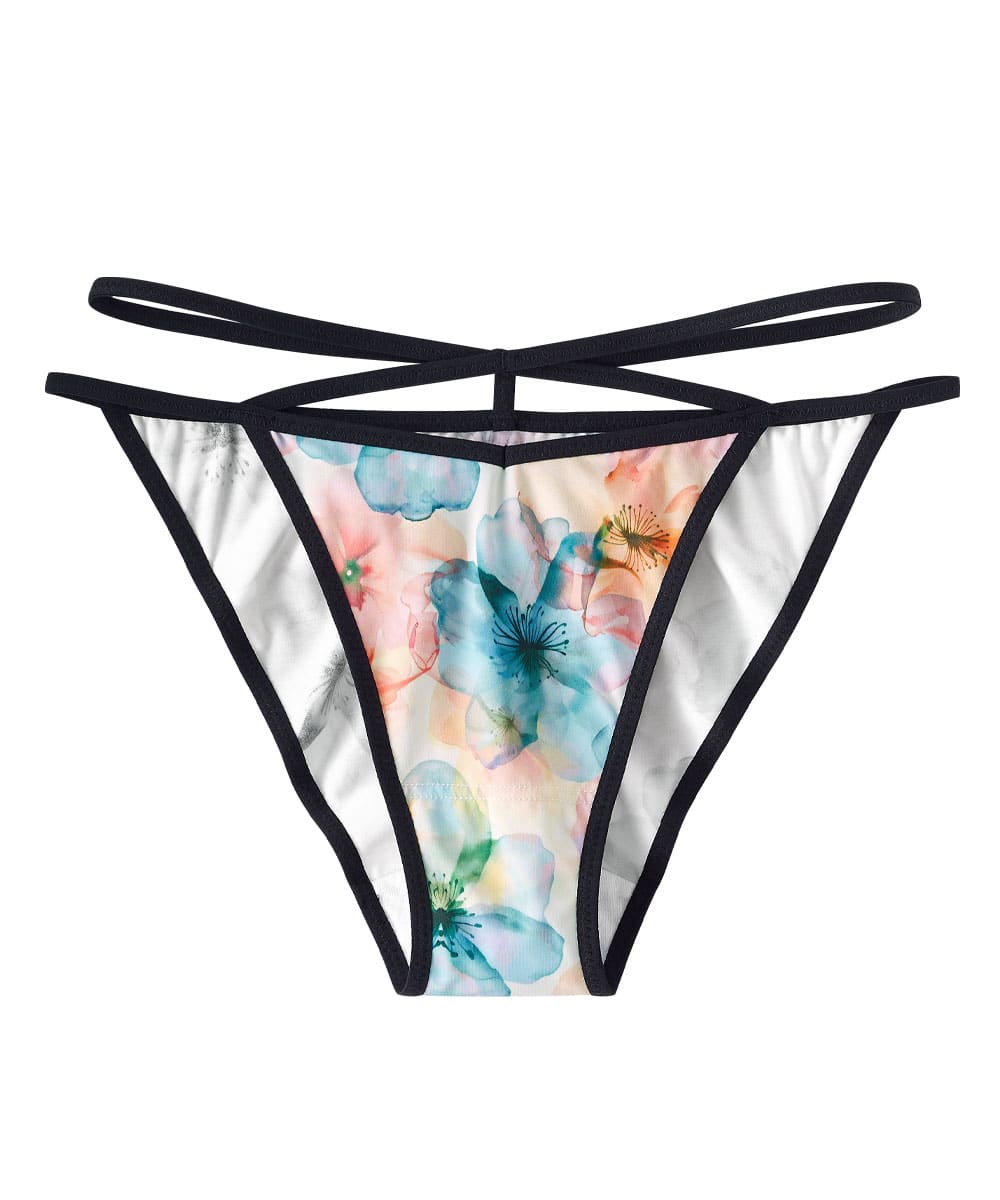 水彩画のような透明感のある花柄を全面にプリントした夏らしいデザインのハーフバックショーツ。サイドにあしらった2本のコードが腰回りをスッキリみせ、SEXYさを演出します。伸縮性のある生地がぴったりフィットします。ヒップの丸みがキレイに見えるハーフバック(チーキー)は、プレーンショーツの安心感とTバックショーツのアウターへの響きにくさのイイとこ取りをした形。ショーツのラインが響きにくいので、タイトなボトムスやワンピースのときにもおすすめです。