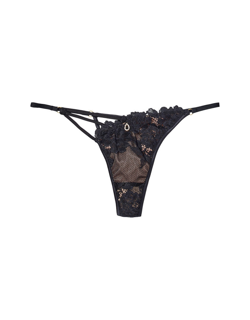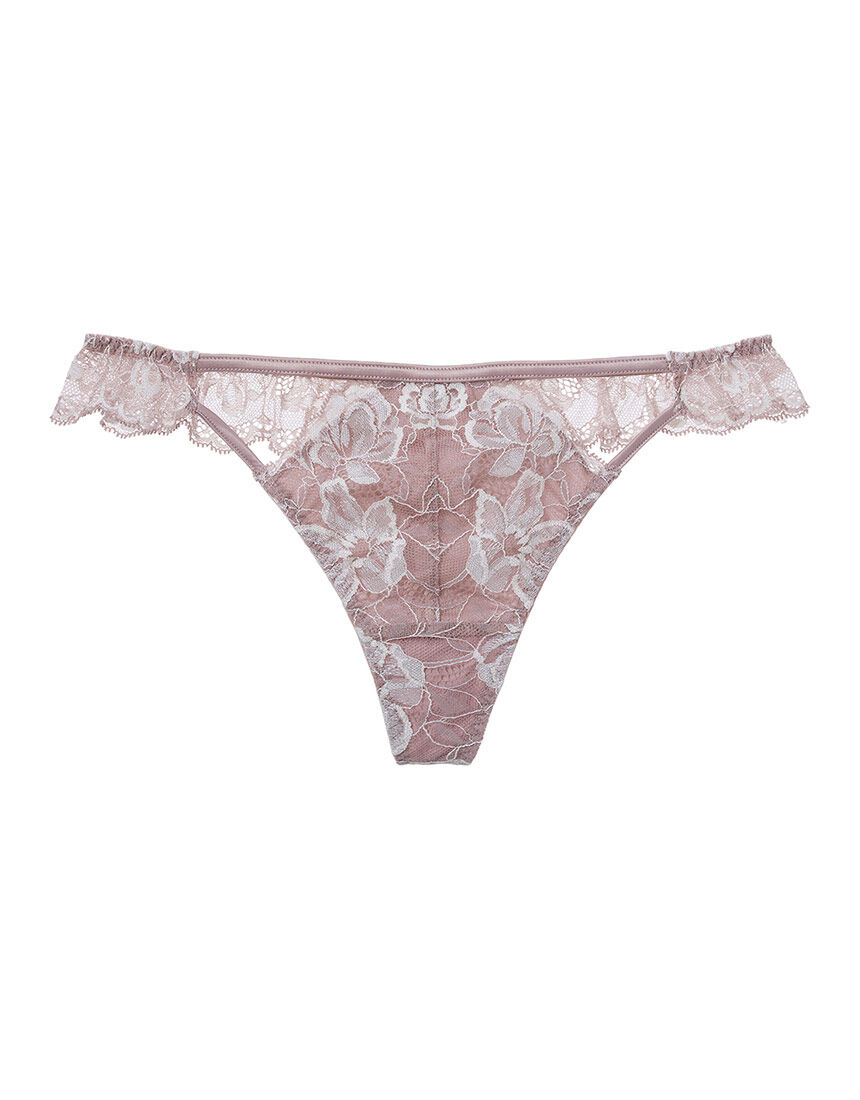 【フロント】・ベージュ系の生地にモチーフカットしたレースを縫い付け、その上から薄手のパワーネットでカバー。・ウエストは伸縮性のある華奢なダブルストリング。上のストリングはフロント中央のゴールドの金具につないであやうげ。好みで2本の角度を変えて楽しめる。【バック】・伸びの良いストレッチレース1枚。・ふちはゴムを使わず、軽い肌あたり。【クロッチ】・表側はパワーネット・肌側はコットン【デザイン】・フロントパネルは上部を逆V型にカットして面積が狭く、センシュアルな印象・同シリーズのショーツも展開【ドラマティックな日常がはじまる。-SALON by PEACH JOHN-】ライフスタイルに上質を求める女性に向けたランジェリー、ラウンジウェアブランド。リアルユースで活躍する機能性と着心地の良さを備え、日常のルーティンをドラマティックに変える色気をプラスしてお届けします。