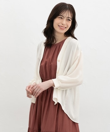 後ろ姿も抜かりなく【デザイン】首元をすっきり見せるVネックに、前後差を付けた裾とバックのゴムシャーリングで、さっと羽織るだけでサマになるデザイン。ゆったりした幅とヒップまで隠れる丈感で体型もカバー。袖口は伸縮性のあるリブで、袖丈が調節しやすく、こなれた印象に。【素材・機能】ワッシャー加工で自然な風合いに仕上げた、程よい透け感で柔らかなシアー素材。【スタイル】シャツが苦手な方でも使いやすく、インナーをタンクトップにして抜け感を出したり、プリントTシャツと合わせたり、ワンピースの上にさらっと羽織ったりと、きれいめにもカジュアルにも幅広く活躍。冷房対策にも◎ ●商品サイズ(cm)[S]バスト127・身丈67・袖丈39・肩幅50[M]バスト130・身丈68・袖丈40・肩幅51[L]バスト136・身丈69・袖丈41・肩幅52[LL]バスト142・身丈70・袖丈41・肩幅54※サイズにつきましては若干の誤差が生じる場合がございます。予めご了承ください。※モデル着用サイズ:Mサイズ※8分袖※身丈は衿ぐり肩位置から後裾まで※後背部分ゴム ●品質/表地 ポリエステル 100%・リブ 綿 55%・ポリエステル 40%・ポリウレタン 5%・別布 ポリエステル 100%■カンボジア製 ●商品サイズ(cm)サイズ,バスト,身丈,袖丈,肩幅S,127,67,39,50M,130,68,40,51L,136,69,41,52LL,142,70,41,54