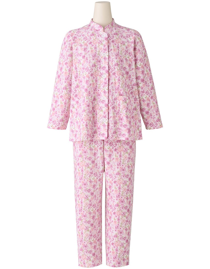 「ぬくいと®AERO」を肌側に使用したふんわりとあたたかい、中わた入りキルトニット素材。明るい花柄プリントで気分も晴れやかに。トップス・ボトムに名前を記入できるネームタグ付き。家庭用タンブル乾燥機対応。ラグラン袖、トップス両前ポケット付き。※「ぬくいと®」は双日インフィニティ株式会社の登録商標です。<なるほど着やすいパジャマのこだわり>・ボタンホールに出し入れしやすいように工夫した、大きめレモン型ボタン。 くぼみが付いてつまみやすいので留めはずしがラク。・ウエストはソフトなゴムを使用。ゴム替え口あり。・前後がわかりやすいように前ウエストの表側につけたサイズネーム。・肌にあたらないようにポケットの中にいれた縫い付けネーム。・袖口とボトムの裾口からゴムを入れて調整ができる、ゴム通し口あり。・股下はひし形のマチ付きで動きがラク。・縫い目の肌側は平らな縫製で、ゴロゴロ感をおさえたやさしい肌ざわり。【サイズ詳細】※身長146cm〜154cmに対応しています。SP:身幅51.5cm 着丈63.0cm 身丈66.0cm 裄丈69.5cm ボトム脇丈91.0cm 裾まわり35.0cm ウエスト60.0cm 股下(レングス)66.5cm ヒップ98.0cm MP:身幅55.5cm 着丈63.0cm 身丈66.0cm 裄丈70.5cm ボトム脇丈92.0cm 裾まわり37.0cm ウエスト65.0cm 股下(レングス)66.5cm ヒップ105.0cm LP:身幅59.5cm 着丈63.0cm 身丈66.0cm 裄丈71.5cm ボトム脇丈93.0cm 裾まわり39.0cm ウエスト71.0cm 股下(レングス)66.5cm ヒップ112.0cm LLP:身幅63.5cm 着丈63.0cm 身丈66.0cm 裄丈72.0cm ボトム脇丈94.0cm 裾まわり41.0cm ウエスト77.0cm 股下(レングス)66.5cm ヒップ119.0cm※出来上がり寸法を表示しております※サイズ詳細の寸法には多少の差異がございます出来上がり寸法の測り方についてはこちら【綿混】パジャマ・ルームウェアはこちらを、【綿100%】パジャマ・ルームウェアはこちらをチェック!