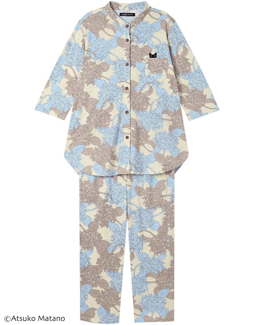 【パジャマ(7分袖ロング丈パンツ)】クリエーター"俣野温子"氏がデザインする、甘くなりすぎない大人かわいいテキスタイルとカラーで、くつろぎ時間を楽しく過ごせるパジャマ&ルームウェア・少しフシ(糸節)の見える生地感が特徴でやさしい肌ざわりの綿100%の天竺素材を使用・エレガントで控えめな華やかさの紫陽花柄のテキスタイル・胸ポケットから顔をのぞかせている黒猫のアップリケがデザインポイント同じ柄のワンピースもございますワンピースはこちら【サイズ詳細】M:身幅51.5cm 着丈74.0cm 身丈70.5cm 肩幅40.0cm 袖丈38.0cm ボトム脇丈95.0cm 裾まわり39.0cm ウエスト58.0cm ヒップ101.0cm 股下(レングス)67.5cm L:身幅55.5cm 着丈74.0cm 身丈70.5cm 肩幅42.0cm 袖丈38.0cm ボトム脇丈95.5cm 裾まわり41.0cm ウエスト63.0cm ヒップ105.0cm 股下(レングス)67.5cm LL:身幅59.5cm 着丈75.0cm 身丈71.5cm 肩幅43.0cm 袖丈38.5cm ボトム脇丈96.0cm 裾まわり44.0cm ウエスト68.0cm ヒップ110.0cm 股下(レングス)67.5cm3L:身幅63.5cm 着丈76.0cm 身丈72.5cm 肩幅45.0cm 袖丈38.5cm ボトム脇丈96.5cm 裾まわり47.0cm ウエスト73.0cm ヒップ115.0cm 股下(レングス)67.0cm※出来上がり寸法を表示しております※サイズ詳細の寸法には多少の差異がございます出来上がり寸法の測り方についてはこちら※アイテムによって柄の出方が異なりますのでご了承ください。