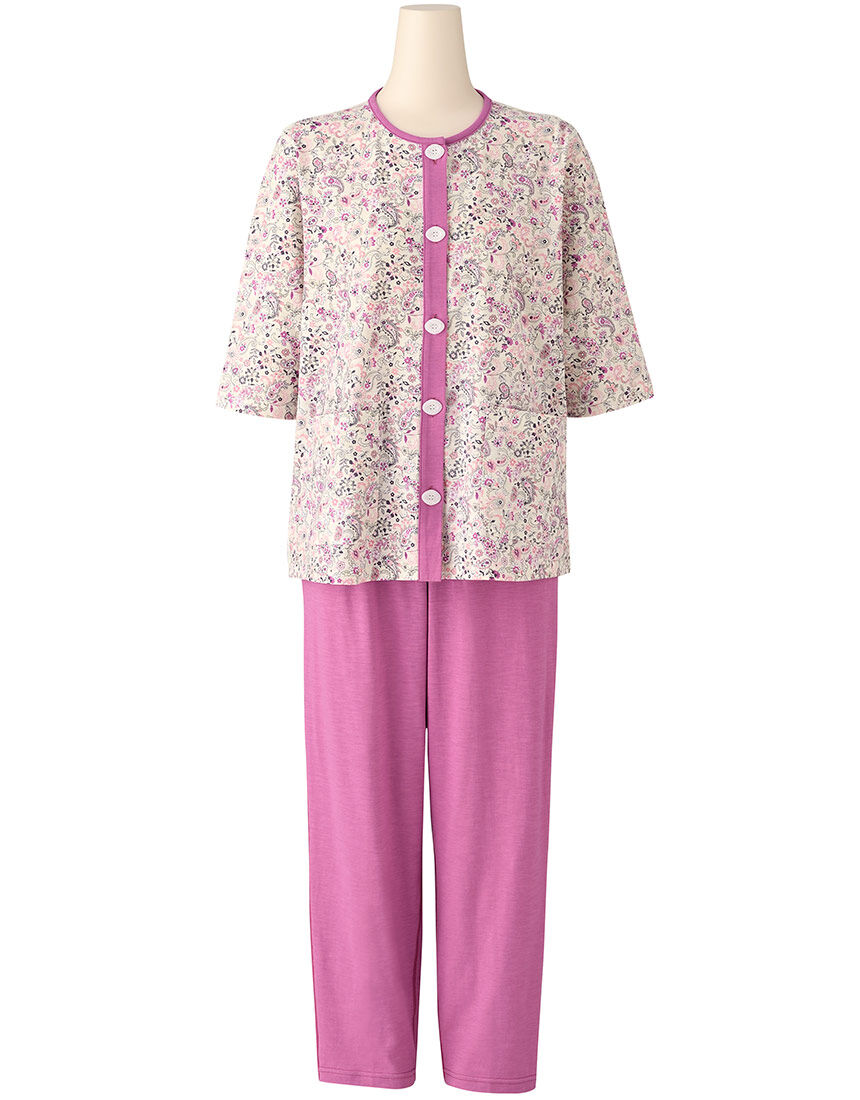 【七分袖・レモンボタン】凹凸のあるスラブ糸を使用した、風合いの涼やかな素材。ストライプ柄に白抜きの花を散りばめた華やかなトップスと、無地のボトムを合わせて。トップス・ボトムに名前が記入できるネームタグ付き。※トップス両前ポケット付き<なるほど着やすいパジャマのこだわり>・ボタンホールに出し入れしやすいように工夫した、大きめレモン型ボタン。 くぼみが付いてつまみやすいので留めはずしがラク。・ウエストはソフトなゴムを使用。ゴム替え口あり。・前後がわかりやすいように前ウエストの表側につけたサイズネーム。・肌にあたらないようにポケットの中にいれた縫い付けネーム。・ゴム通し口あり。袖口とボトムの裾口からゴムを入れて調整ができる。・股下はひし形のマチ付きで動きがラク。・縫い目の肌側は平らな縫製で、ゴロゴロ感をおさえたやさしい肌ざわり。【サイズ詳細】※身長146cm〜154cmに対応しています。SP:身幅50.0cm 着丈63.0cm 肩幅38.0cm 袖丈36.5cm ボトム脇丈91.0cm 裾まわり35.0cm ウエスト60.0cm 股下(レングス)66.5cm ヒップ103.0cm MP:身幅54.0cm 着丈63.0cm 肩幅40.0cm 袖丈36.5cm ボトム脇丈92.0cm 裾まわり37.0cm ウエスト65.0cm 股下(レングス)66.5cm ヒップ110.0cm LP:身幅58.0cm 着丈63.0cm 肩幅41.0cm 袖丈36.5cm ボトム脇丈93.0cm 裾まわり39.0cm ウエスト71.0cm 股下(レングス)66.5cm ヒップ117.0cm LLP:身幅62.0cm 着丈63.0cm 肩幅43.0cm 袖丈36.0cm ボトム脇丈94.0cm 裾まわり41.0cm ウエスト77.0cm 股下(レングス)66.5cm ヒップ124.0cm※出来上がり寸法を表示しております※サイズ詳細の寸法には多少の差異がございます出来上がり寸法の測り方についてはこちら【綿100%】パジャマ・ルームウェアはこちらを、【綿混】パジャマ・ルームウェアはこちらをチェック!