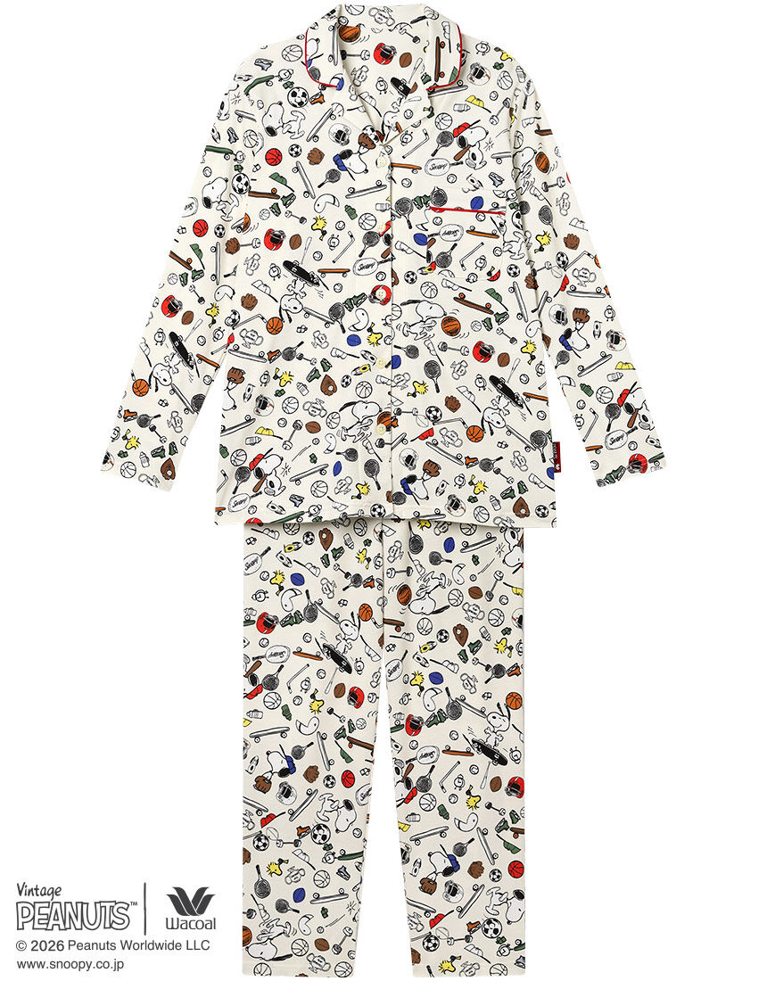 1950年に新聞コミックとしてスタートした「PEANUTS」とワコールがコラボレーション。世界中で愛されるスヌーピーや個性豊かな仲間たちのデザインでおうち時間を楽しんで。・本体に、綿100%のスムース素材を使用・スヌーピーが楽しくスポーツをしているプリント・パイピングのカラーもアクセントに【サイズ詳細】ロング袖・ロング丈パンツM:身幅52.0cm 着丈67.0cm 身丈69.5cm 肩幅40.0cm 袖丈55.0cm ボトム脇丈95.0cm 裾まわり39.0cm ウエスト58.0cm 股下(レングス)67.5cm ヒップ100.0cm L:身幅56.0cm 着丈67.0cm 身丈69.5cm 肩幅41.5cm 袖丈55.0cm ボトム脇丈95.5cm 裾まわり41.0cm ウエスト63.0cm 股下(レングス)67.0cm ヒップ104.0cm※出来上がり寸法を表示しております※サイズ詳細の寸法には多少の差異がございます 出来上がり寸法の測り方についてはこちら※アイテムによって柄の出方が異なりますのでご了承ください。