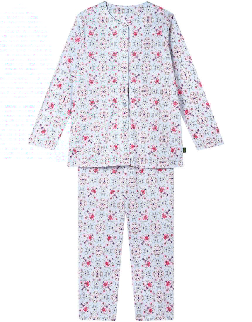 【パジャマ(ロング袖ロングパンツ)】「ワコール人間科学研究開発センター」の女性の体型データをもとにしたグランダー独自のサイズ設計は、ゆったり快適な着ごこち。・着ごこちゆったり親切設計のポイント1.背・脇に縫い付けネームがなく、やさしい肌あたり2.留めはずしラクラク大きめボタン3.やわらかなゴムでウエストがラク4.深めの前合わせですきまから胸もとが見えにくい5.ズボンの前後がわかりやすい目印付き6.くいこみにくく動きやすいマチ付き7.裾口、袖口、ウエストにゴム替え口・本体に、綿100%の薄手ニットを使用・小花を敷き詰めたようなプリント柄・襟まわりにはレースをあしらい、かわいらしい印象のデザイン・腕が上げやすく、動かしやすいラグランスリーブ【サイズ詳細】SP:身幅51.0cm 着丈64.5cm 身丈68.0cm 裄丈72.0cm ボトム脇丈90.0cm 裾まわり36.5cm ウエスト55.0cm 股下(レングス)62.0cm ヒップ101.5cm MP:身幅55.0cm 着丈64.5cm 身丈68.0cm 裄丈73.0cm ボトム脇丈90.5cm 裾まわり38.0cm ウエスト60.0cm 股下(レングス)62.0cm ヒップ106.5cm LP:身幅59.0cm 着丈64.5cm 身丈68.5cm 裄丈74.0cm ボトム脇丈91.5cm 裾まわり39.5cm ウエスト65.0cm 股下(レングス)62.0cm ヒップ111.5cm M:身幅55.0cm 着丈69.5cm 身丈73.0cm 裄丈75.0cm ボトム脇丈95.5cm 裾まわり38.0cm ウエスト60.0cm 股下(レングス)65.5cm ヒップ109.5cm L:身幅59.0cm 着丈69.5cm 身丈73.5cm 裄丈76.0cm ボトム脇丈96.5cm 裾まわり39.5cm ウエスト65.0cm 股下(レングス)65.5cm ヒップ114.5cm LL:身幅63.0cm 着丈70.5cm 身丈74.5cm 裄丈77.5cm ボトム脇丈96.5cm 裾まわり41.5cm ウエスト70.0cm 股下(レングス)65.5cm ヒップ119.5cm※出来上がり寸法を表示しております※サイズ詳細の寸法には多少の差異がございます出来上がり寸法の測り方についてはこちら※アイテムによって柄の出方が異なりますのでご了承ください。【綿100%】パジャマ・ルームウェアはこちらをチェック!