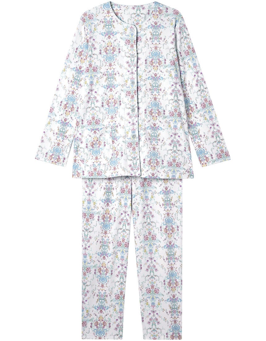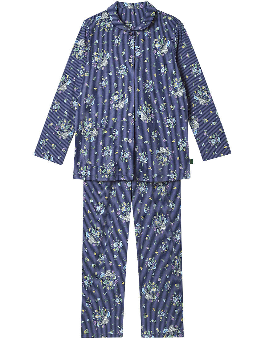 【パジャマ(ロング袖ロングパンツ)】1793年に誕生以来、代表される「ハドンホール」柄を始め、多くのコレクションを世に送り出し続けている「ミントン」。その気品あふれる美しい柄を使用したパジャマ。・身生地はふわっとやわらかな綿100%のスムース素材を使用・〈ハドンホール〉柄をアレンジした、クラシックで上品なやさしい雰囲気のデザイン※〈ハドンホール〉1948年にデザインされ、発売以来、世界中で愛されているロングセラーの図柄。パッションフラワー、パンジー、カーネーションなどが図案化され、東洋的なエキゾチシズムが感じられるデザイン[資料元:(株)川島織物セルコン]【サイズ詳細】S:身幅48.0cm 着丈67.0cm 身丈69.5cm 肩幅39.0cm 袖丈54.5cm ボトム脇丈95.0cm 裾まわり37.0cm ウエスト53.0cm ヒップ97.0cm 股下(レングス)68.0cm M:身幅52.0cm 着丈67.0cm 身丈69.5cm 肩幅40.0cm 袖丈55.0cm ボトム脇丈95.0cm 裾まわり39.0cm ウエスト58.0cm ヒップ100.5cm 股下(レングス)67.5cm L:身幅56.0cm 着丈67.0cm 身丈69.5cm 肩幅41.5cm 袖丈55.0cm ボトム脇丈95.5cm 裾まわり41.0cm ウエスト63.0cm ヒップ104.5cm 股下(レングス)67.0cm LL:身幅60.0cm 着丈68.0cm 身丈71.0cm 肩幅43.0cm 袖丈55.5cm ボトム脇丈96.0cm 裾まわり44.0cm ウエスト68.0cm ヒップ109.5cm 股下(レングス)67.0cm※出来上がり寸法を表示しております※サイズ詳細の寸法には多少の差異がございます出来上がり寸法の測り方についてはこちら※アイテムによって柄の出方が異なりますのでご了承ください。【綿100%】パジャマ・ルームウェアはこちらを、【綿混】パジャマ・ルームウェアはこちらをチェック!